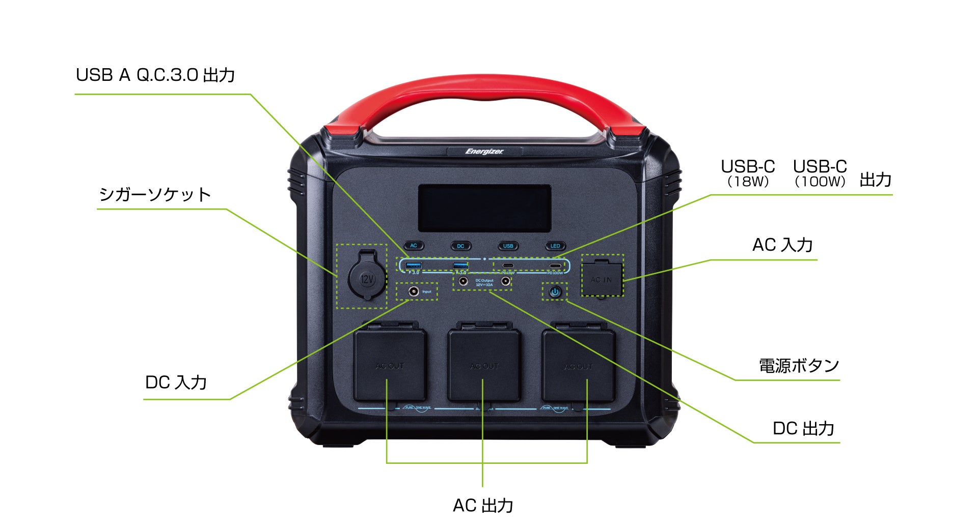 12V⎓10A×2(最大10A) 最大12V⎓10A×1 DC出力+シガーソケット合計120W |