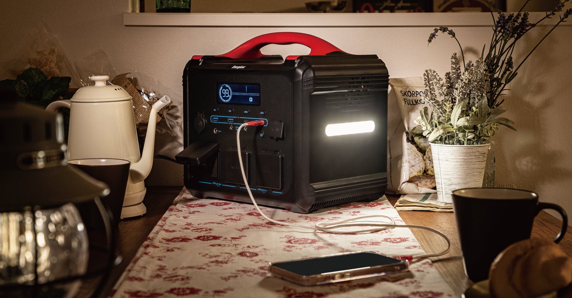停電時に一番不安なのは、明かりがないブラックアウト状態です。Energizer®製ポータブル電源は全ての機種に480lm(6W)の大型LEDが搭載されてます。