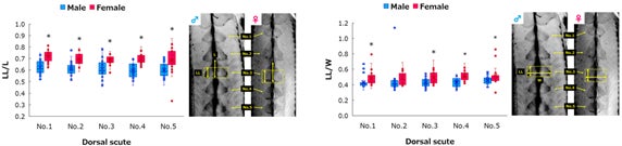 当社のアクアポニックスプラントで養殖しているDNA検査法により雌雄を判別済みのコチョウザメ成魚を対象に、背中の硬鱗を撮影しました。撮影した画像を解析し、鱗の長さや幅などのデータを取得後、得られた測定値を基に複数の指標を作成し、雌雄差を解析しました。その結果、いくつかの指標において統計的に有意な雌雄差が認められました(図1)。さらに、開発した指標を基に目視判別の可能性を検討したところ、複数の指標を組み合わせてスコア化することで、雌雄を明確に区別できることが確認されました。