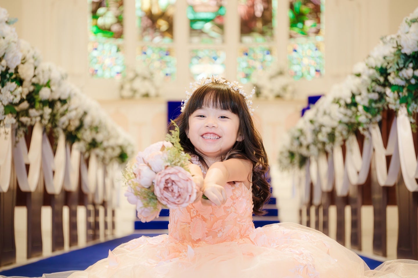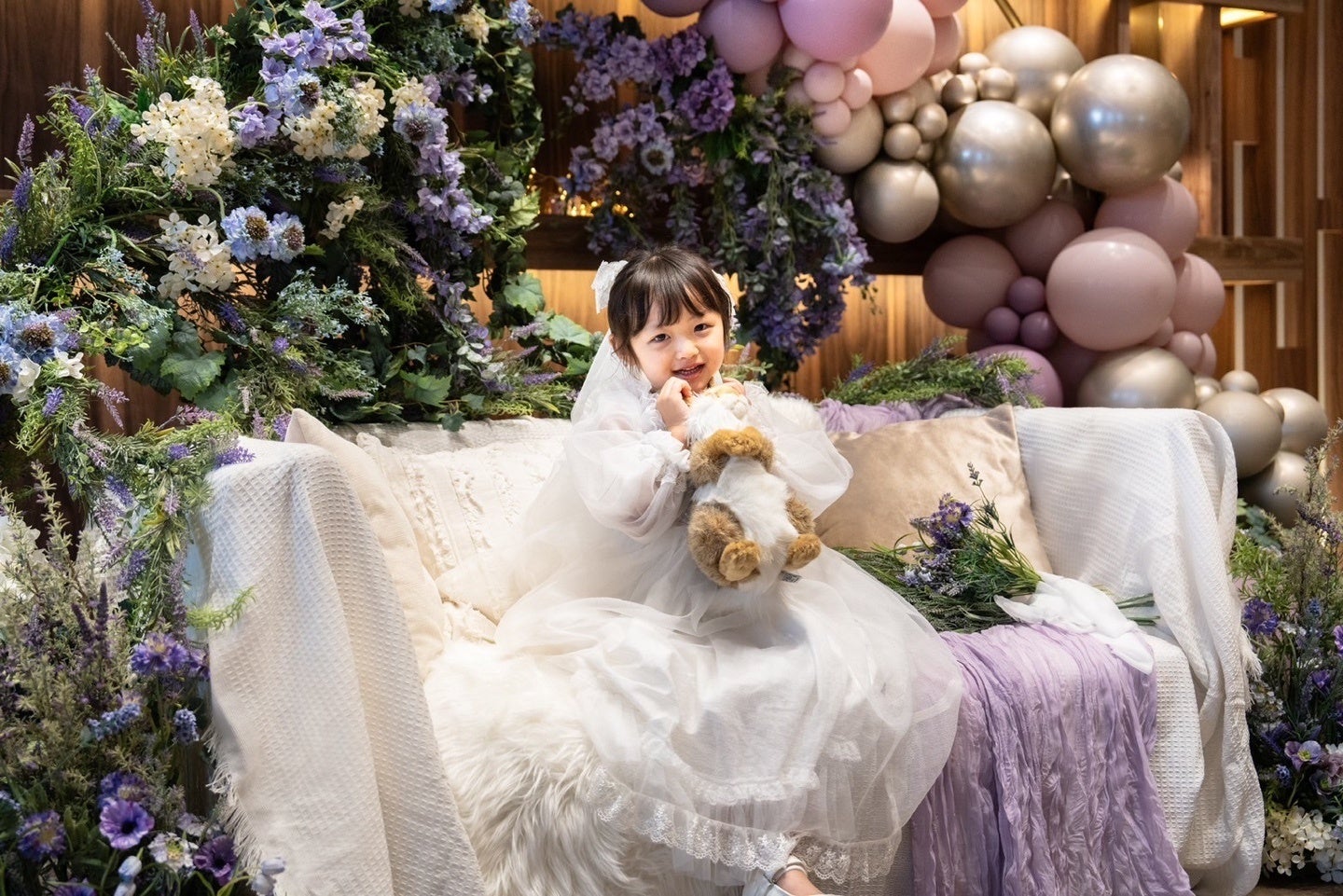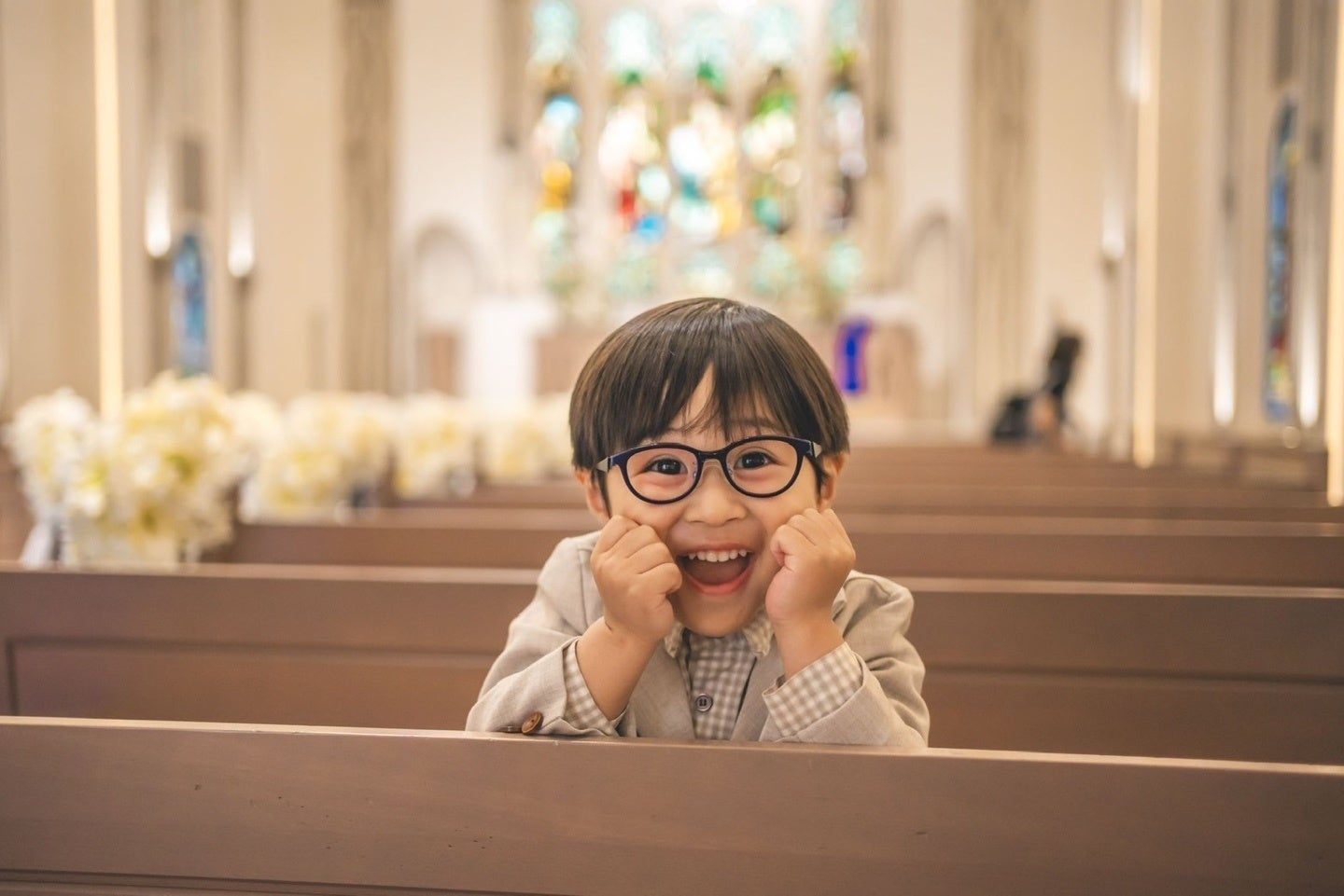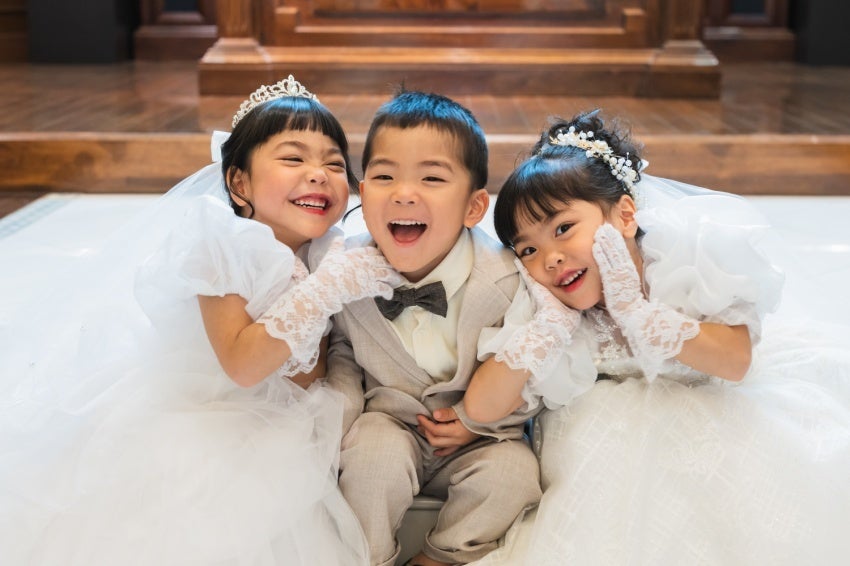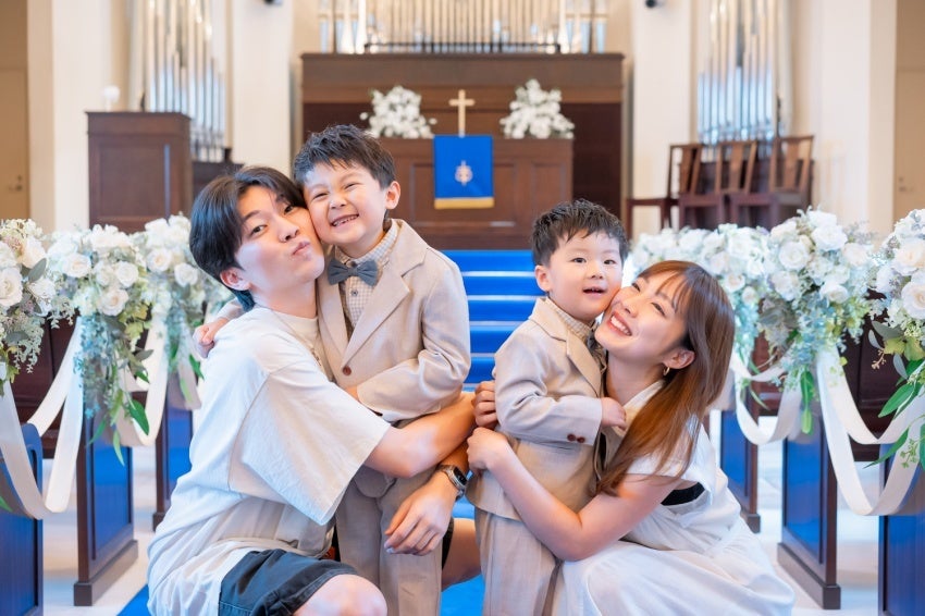 アニヴェルセルで結婚式をされたお夫婦が、ご自身のお子様にチャペルでドレスやタキシードを着用して想い出のフォト撮影を行うことができます。家族フォトや兄弟フォトも大人気。