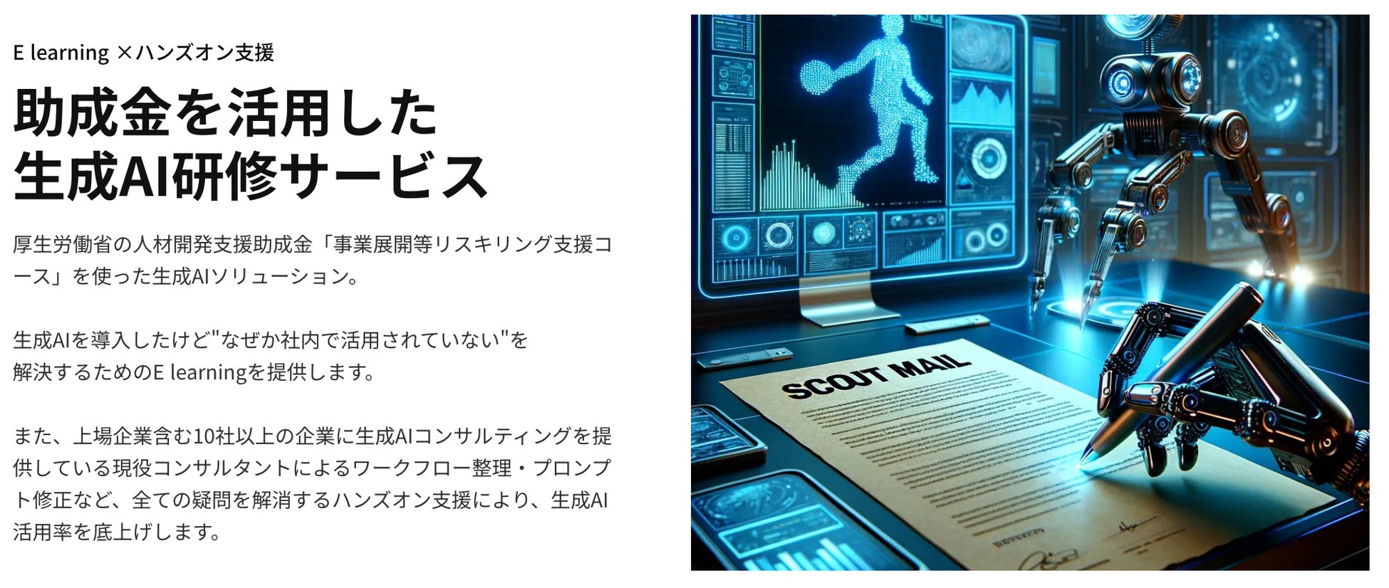 厚生労働省の補助金である人材開発支援助成金"事業展開等リスキリング支援コース"を利用することで、最大75%の助成を受けながら、生成AI導入を推進することができます。