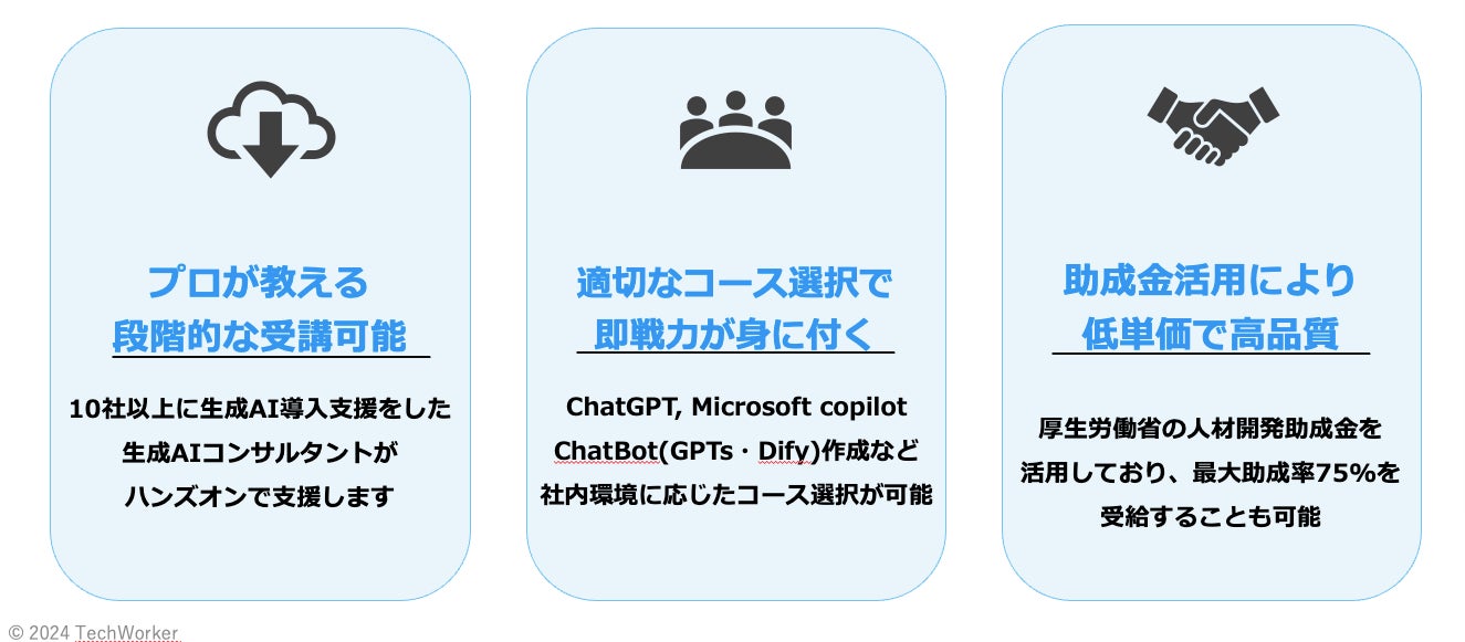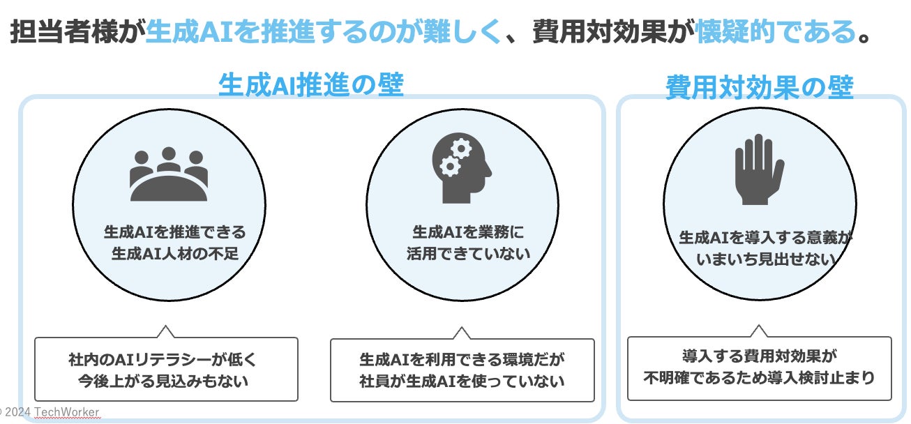 株式会社TechWorkerは、生成AIを導入したけど"なぜか社内で活用されていない..."を解決するために、生成AI研修サービスを提供開始しました。"生成AI推進の壁"と"費用対効果の壁"を、10社以上の生成AIコンサルティング経験のある現役コンサルタントが解決します。
