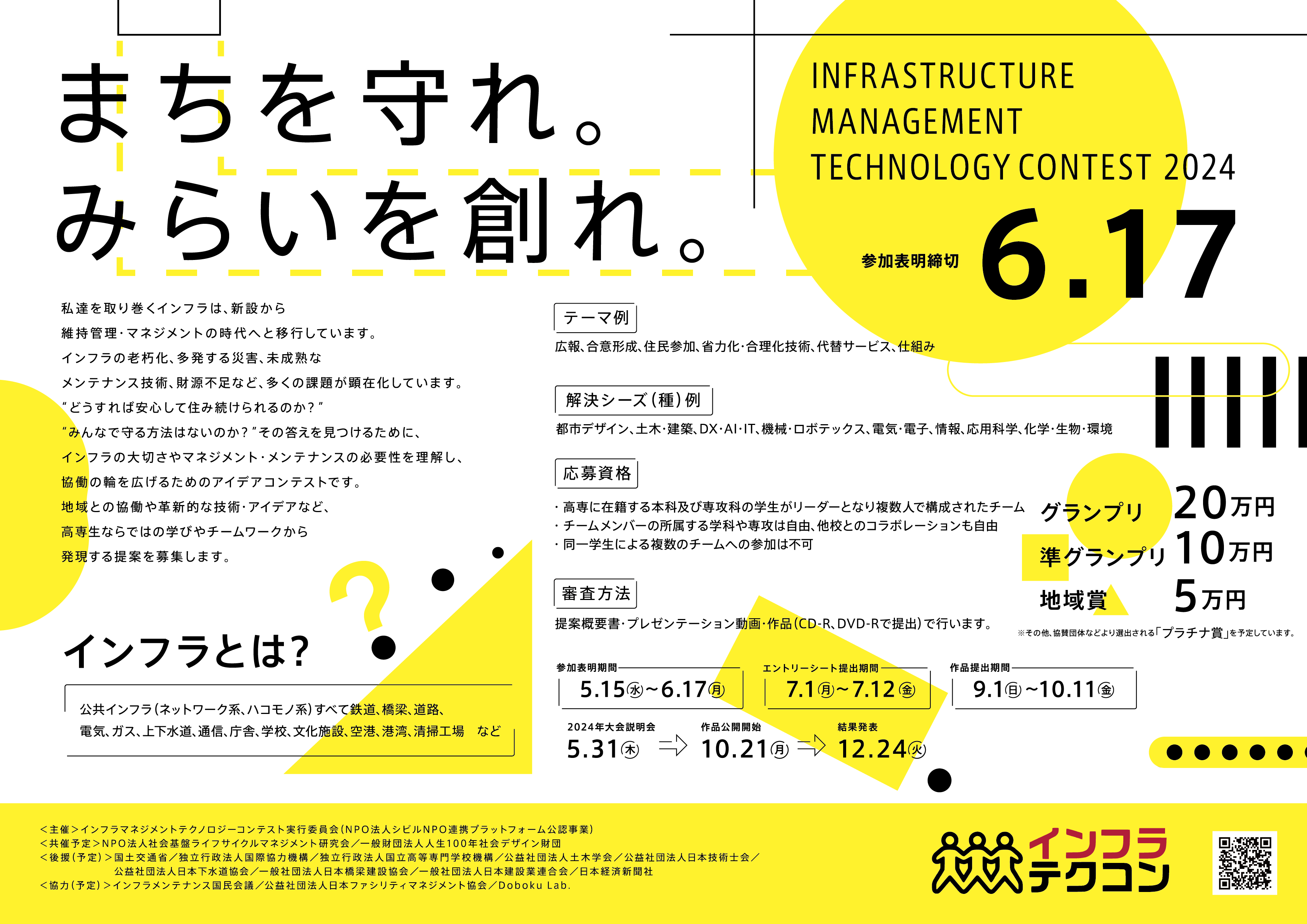 インフラマネジメントテクノロジーコンテスト実行委員会は2024年5月15日から、高専生を対象とする「第5回インフラマネジメントテクノロジーコンテスト2024」(略:インフラテクコン)の1次募集を開始します。締め切りは6月17日です。