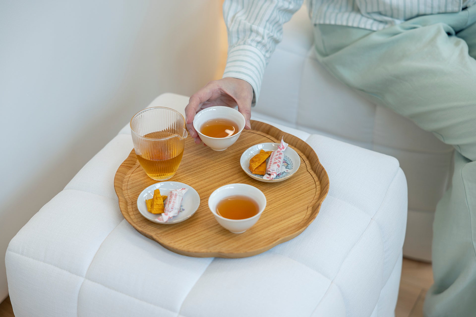 ショールームには、SLEEPY TOFUが製作した家具やキューブ型スツールのほか、環境に配慮した素材や北欧テキスタイルを採用し、空間全体の統一感とブランドらしい優しさを両立。名作照明やデザインチェアを組み合わせることで、SLEEPY TOFU製品の高いデザイン性を引き立て、「お店っぽく見せない」暮らしのリアリティを追求。また、空間の一角では、季節の台湾茶をご提供いたします。台湾の陶器メーカーのヴィンテージの絵皿など、台湾や日本、古いものと新しいものと、様々な要素を組み合わせた茶器のセッティングで、家にいるような懐かしさと心地よさを感じていただけます。