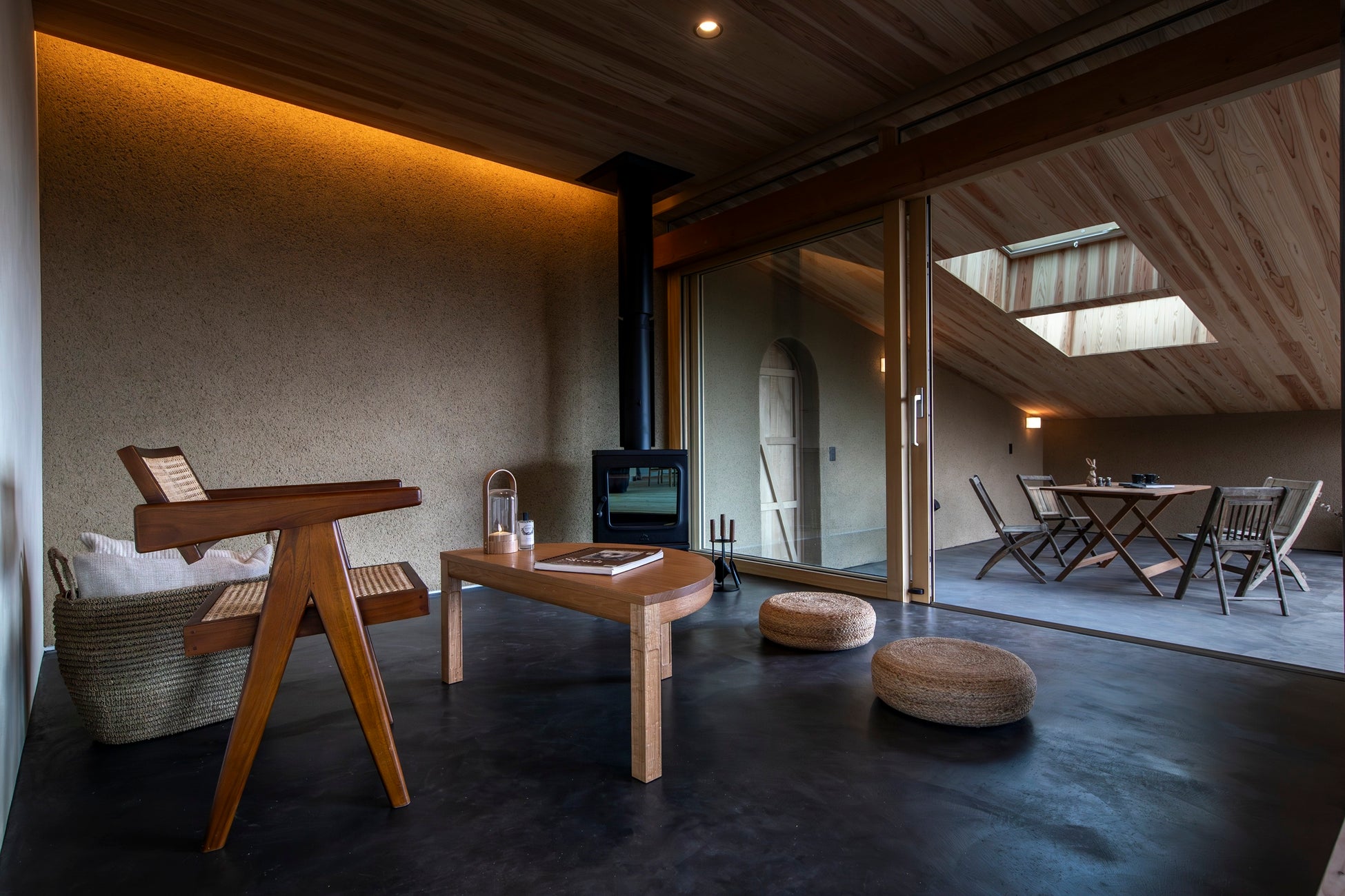 黒モルタル土間と薪ストーブ、トップライトのある外リビングで四季と星空を楽しめる。開放感あふれる住宅。