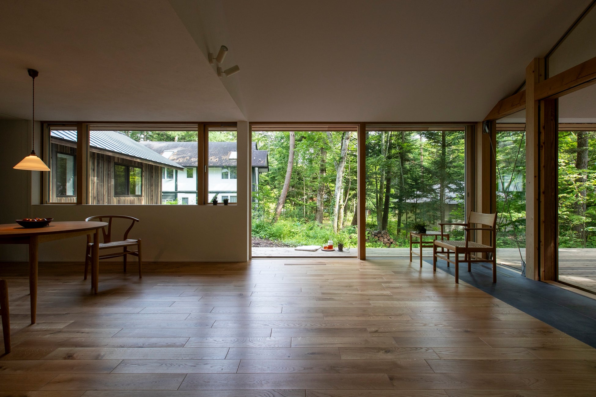 自然の息吹を招く広い開口とウッドデッキが、内と外を心地よくつなぐ静謐な住まい。