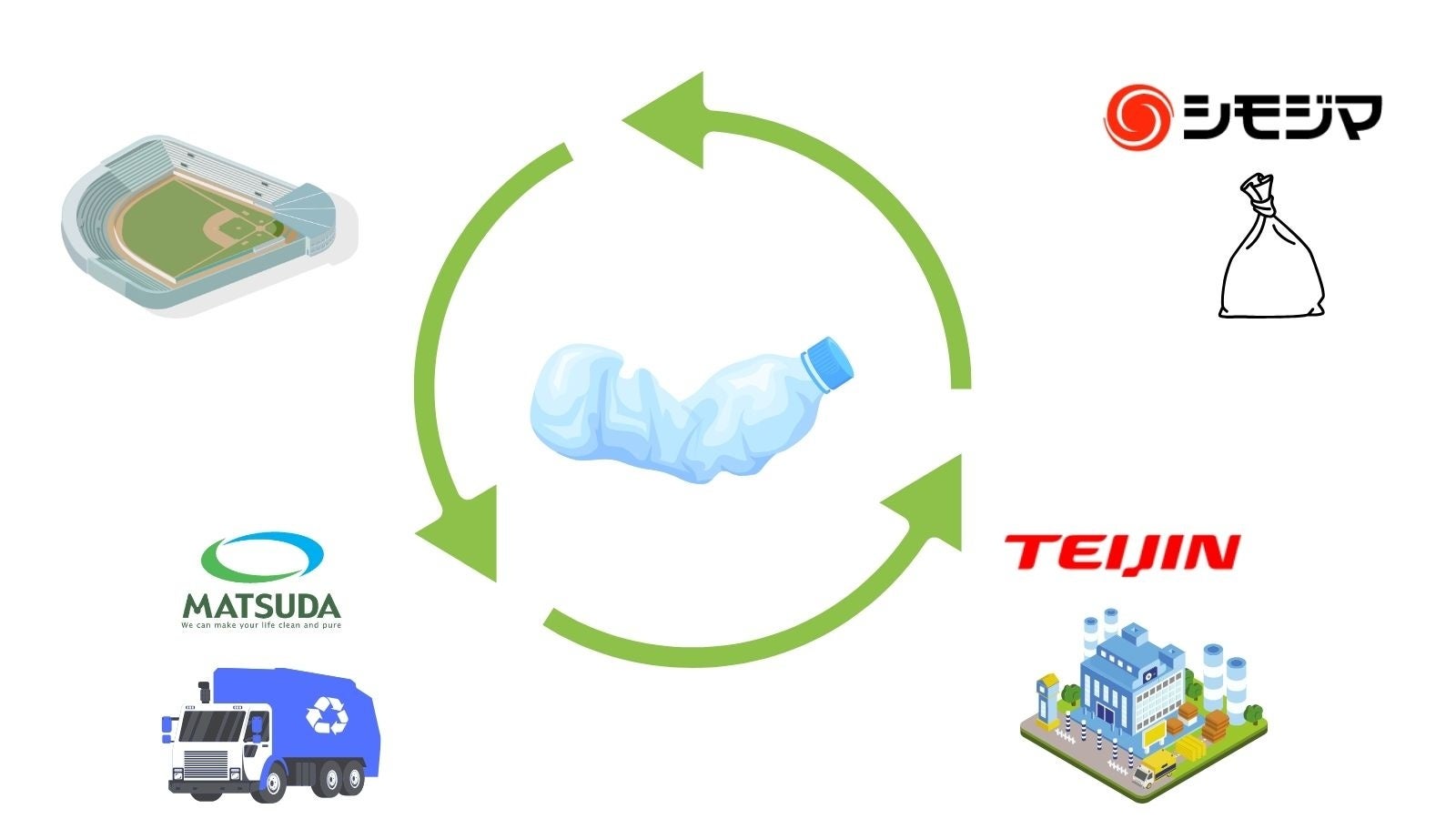 マツダ株式会社ではこのたび、帝人フロンティア株式会社様、株式会社シモジマ様と共に、野球やサッカーなどのスタジアムで回収したプラスチックカップやペットボトルなどの再生可能な原料資源を一部使用した「リサイクルごみ袋」を、資源が排出されたスタジアムで再び使用する、循環型リサイクルの取組みに参画します。