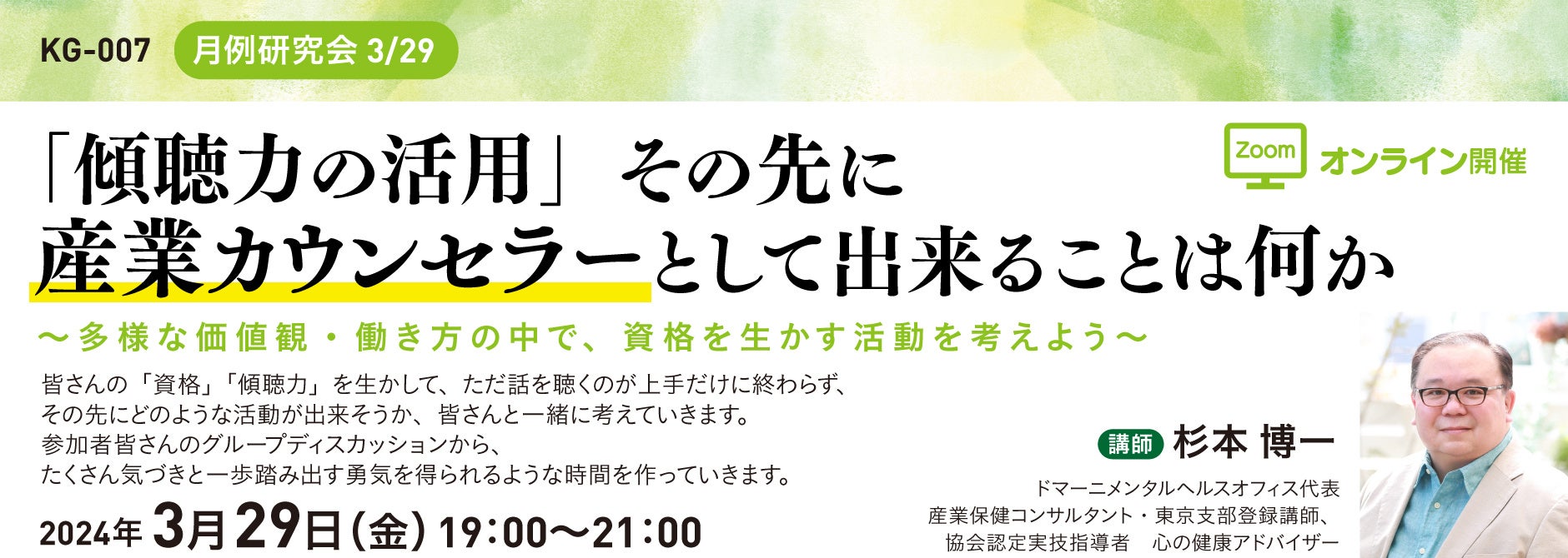 3月29日(金)に、産業保健コンサルタントの杉本博一氏による『「傾聴力の活用」その先に産業カウンセラーとして出来ることは何か』をオンラインで開催いたします。