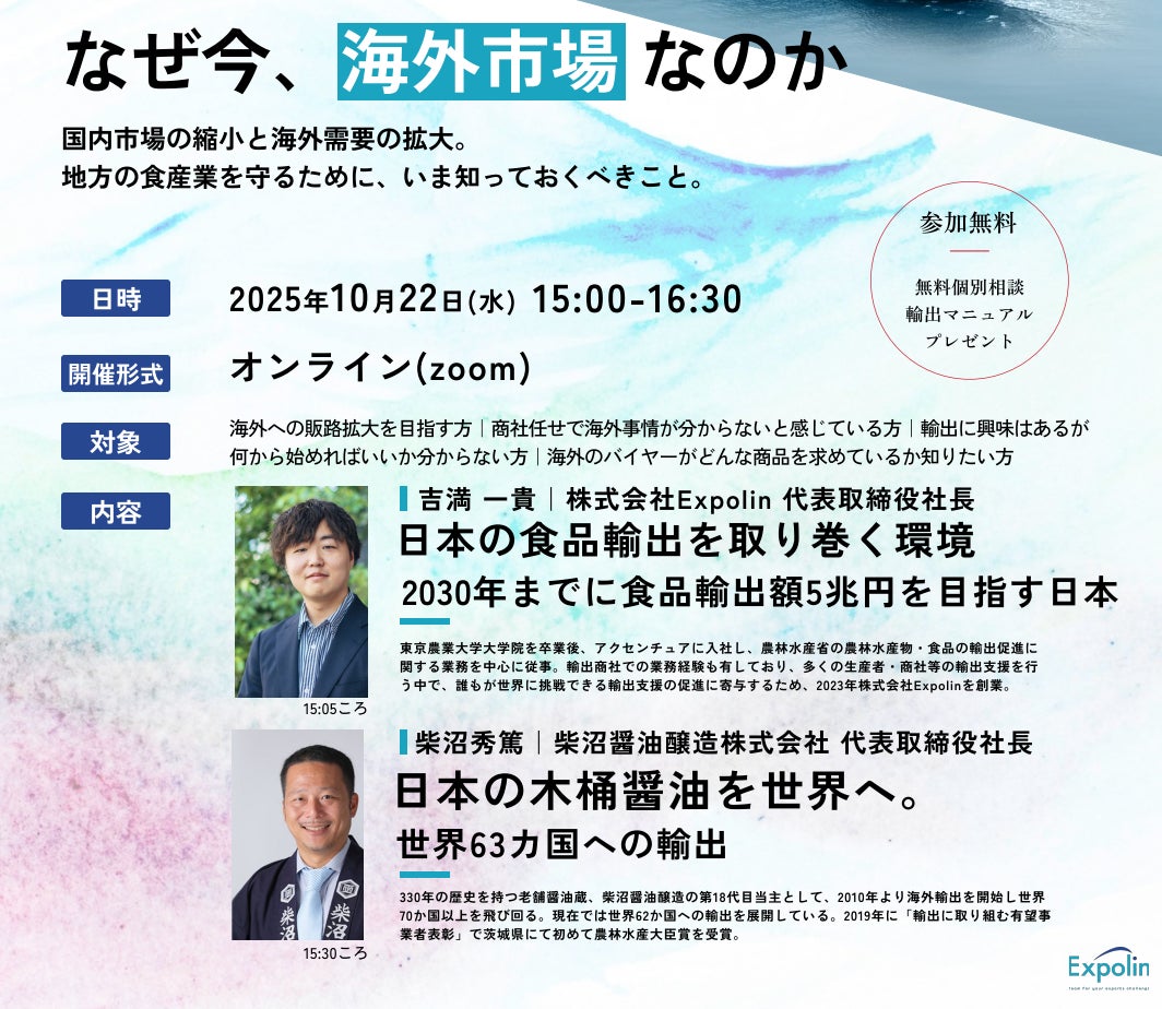 また、サービス開始を記念して**2025年10月22日(水)にオンラインセミナー「なぜ今、海外市場なのか」**を開催し、『Expolin Starter』の概要も紹介いたします。