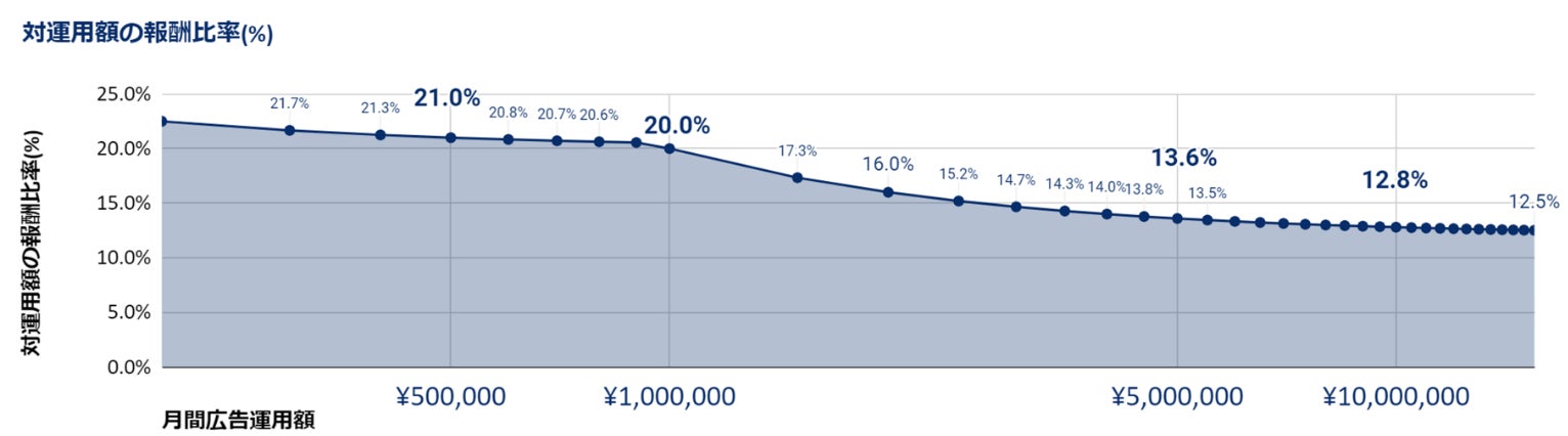 「アドクモ」の運用フィーは、「運用額10%+運用管理費」。広告運用費に応じて対運用額の報酬比率(%)が低減していく料金体系です。
