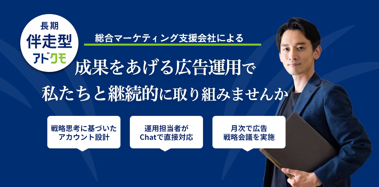 伴走型で広告運用を行うアドクモサービスにより、クライアント企業は広告運用担当者を採用しなくても安定的な運用成果を上げることができ、事業戦略の構築や計画の推進により集中することが可能になります。また、検索型広告やSNS広告など、複数の媒体にまたがる広告運用も、トータルでご支援可能です。