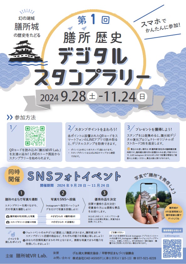 「膳所城VR Lab.」は2020年から5年の歳月をかけて、膳所城のデジタル復元を行いました。このプロジェクトは、株式会社CAD ASSISTが未来継承アーカイブ事業として、立命館大学理工学部、理工学研究科の学生達と共に行う『デジタルの地産地消と地域振興』を目的に活動しているものです。この度は、「出張!お城EXPO in滋賀・びわ湖」初出展と「第一回 歴史スタンプラリー」のご案内です。