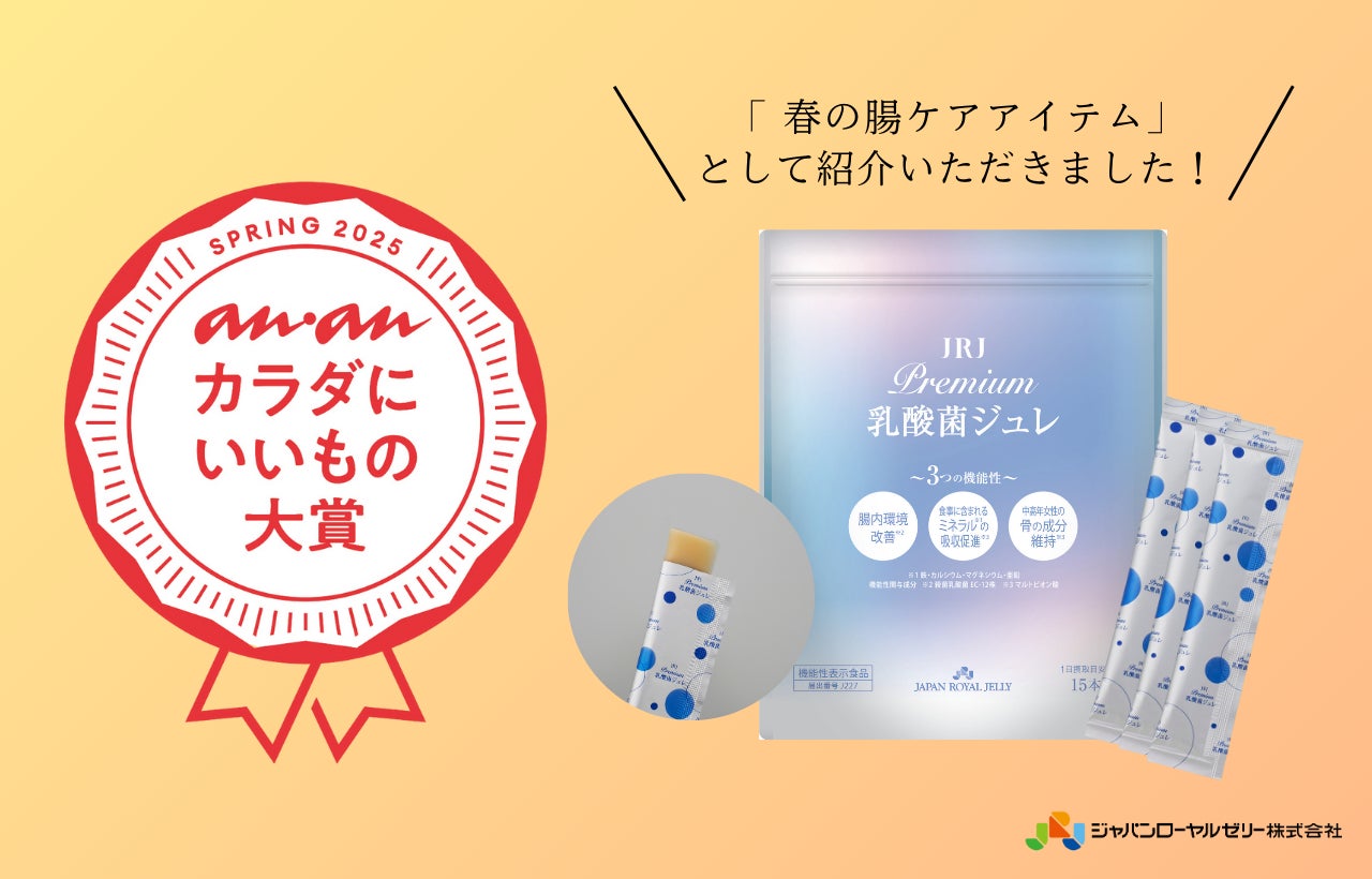 ジャパンローヤルゼリー株式会社(所在地:東京都新宿区、代表取締役社長:日髙 景介)が販売する「JRJ プレミアム乳酸菌ジュレ」(https://jrj-shop.jp/products/njelly/)が、2025年4月9日(水)発売の雑誌「anan」(マガジンハウス社)の「カラダにいいもの大賞 2025・春」を受賞しました。