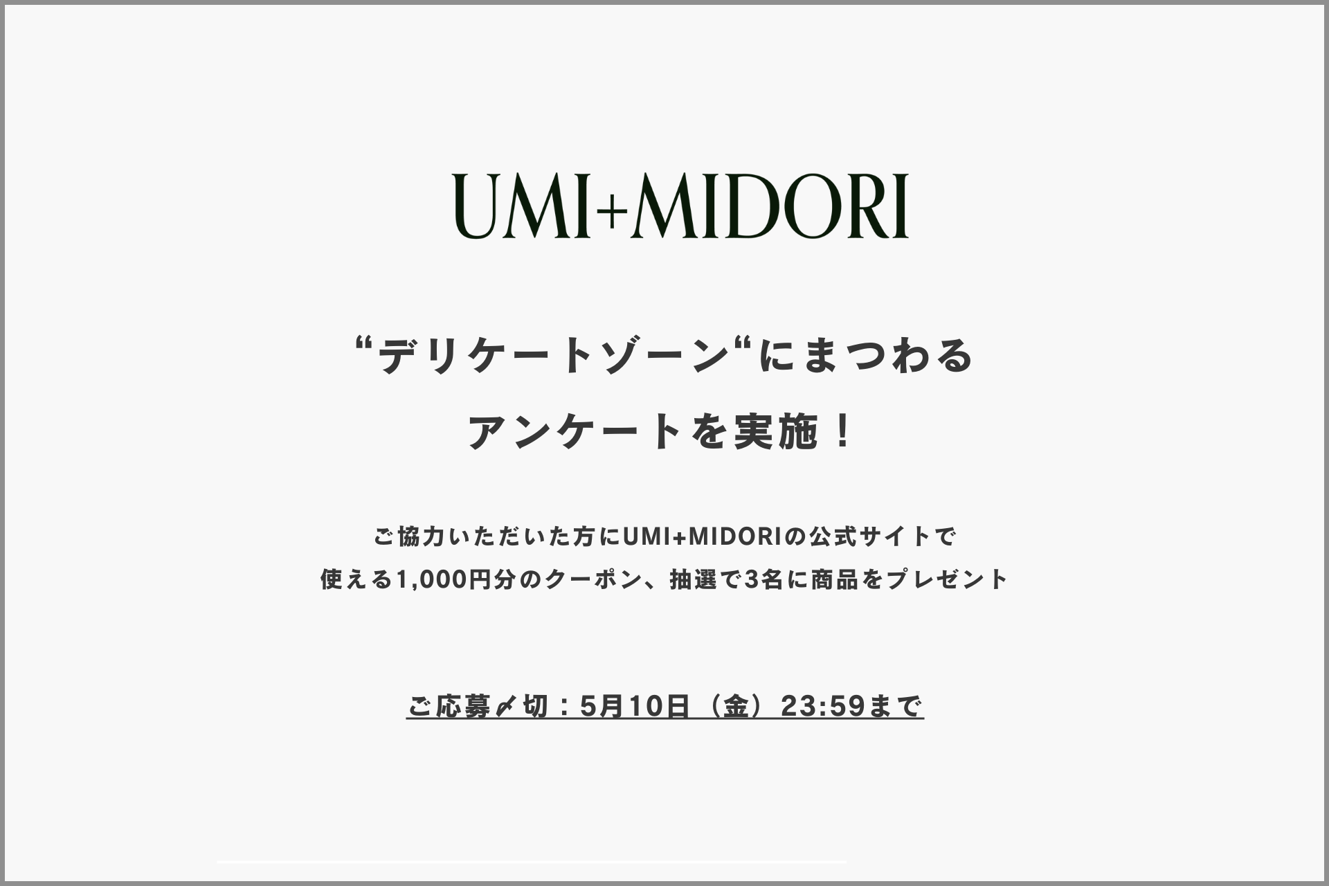 デリケートゾーンに関するアンケート調査を実施。ご協力いただいた方全員にクーポン(1,000円分)をプレゼント!抽選で3名の方にUMI+MIDORIケアセット(10,000円分)をプレゼントいたします。