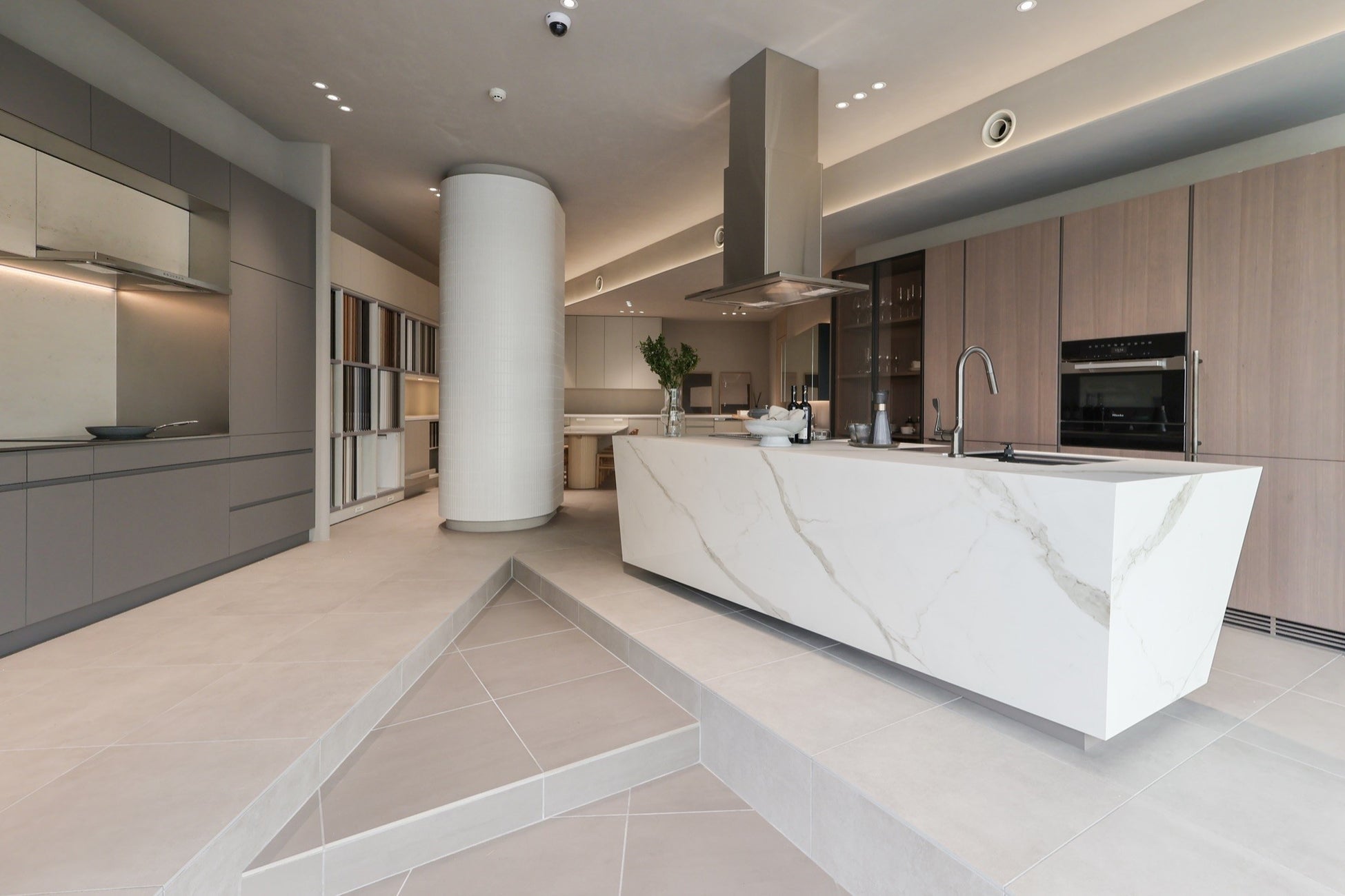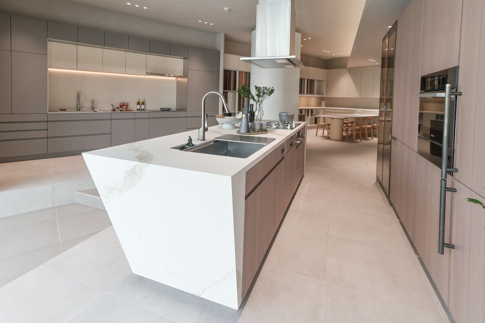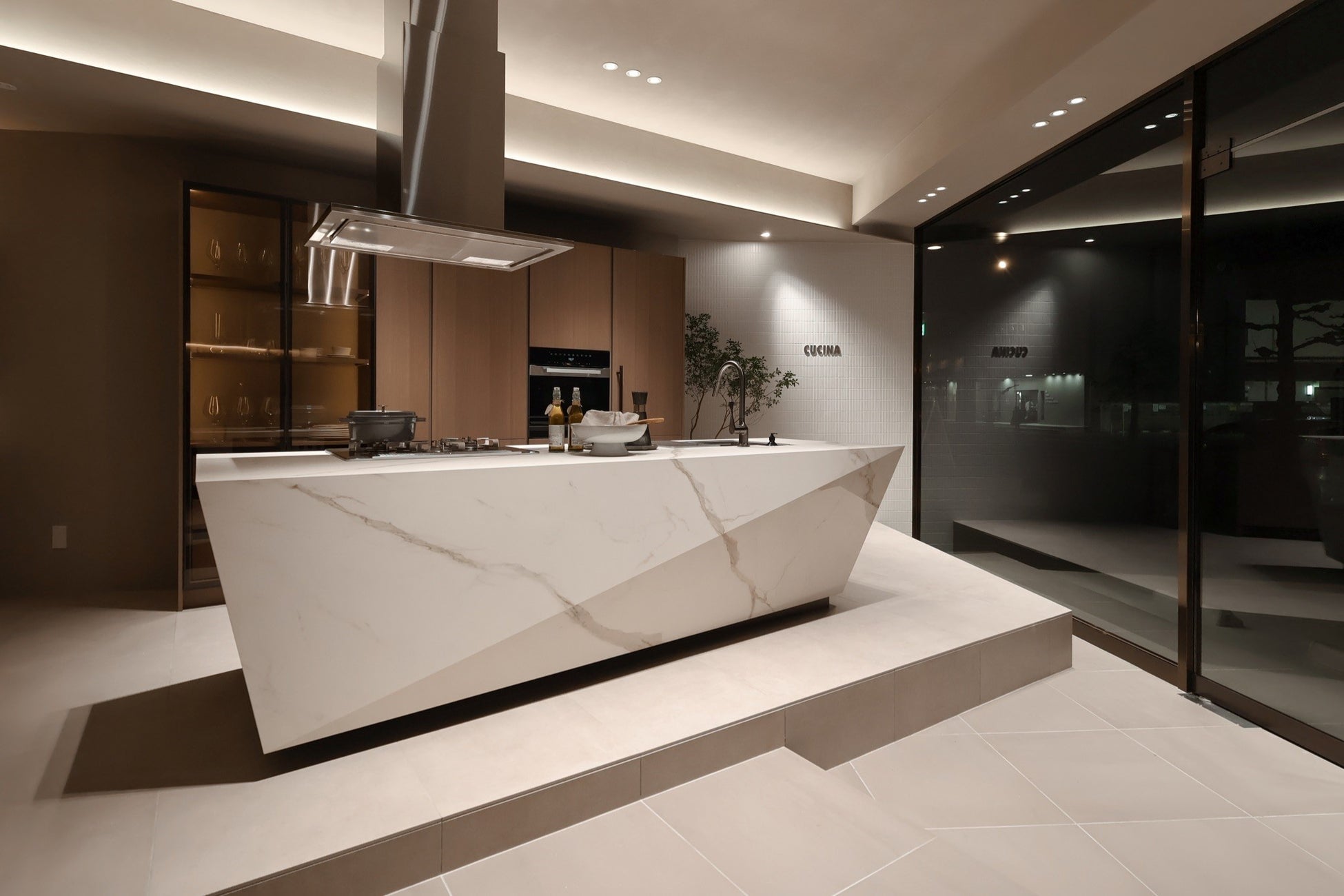館内にはキッチン2台と洗面化粧台1台を展示。天然石を切り取ったような大胆な異形が目を惹く、迫力のあるシンボル的なアイランドキッチンがお客様をお迎えします。