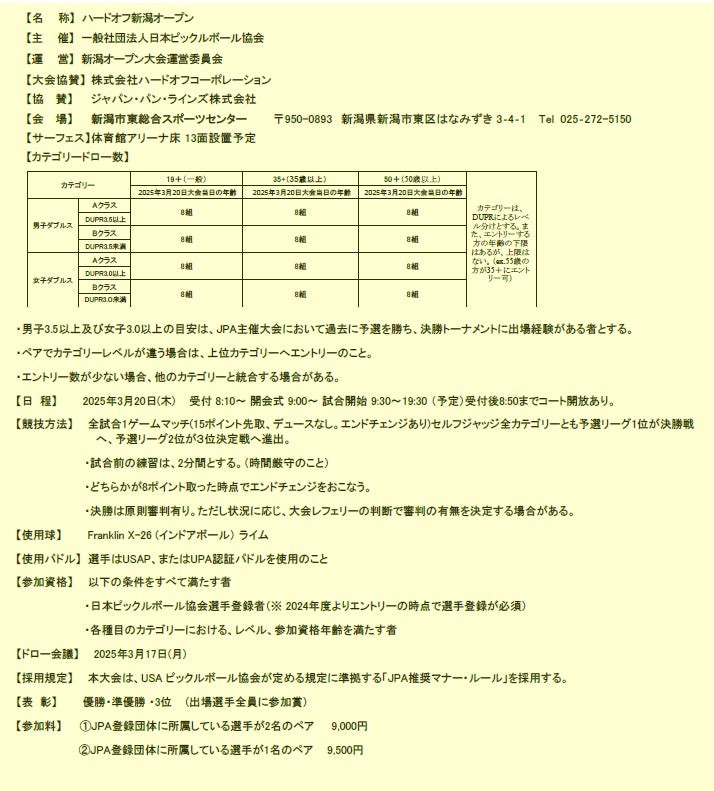 「カシマヤ製作所」が副会長を務める日本ピックルボール協会(JPA)は、2025 年 3 月 20 日(木・祝) にピックルボール協会の公認大会「ハードオフ新潟オープン」を新潟県新潟市の東総合スポーツセンターで開催します。