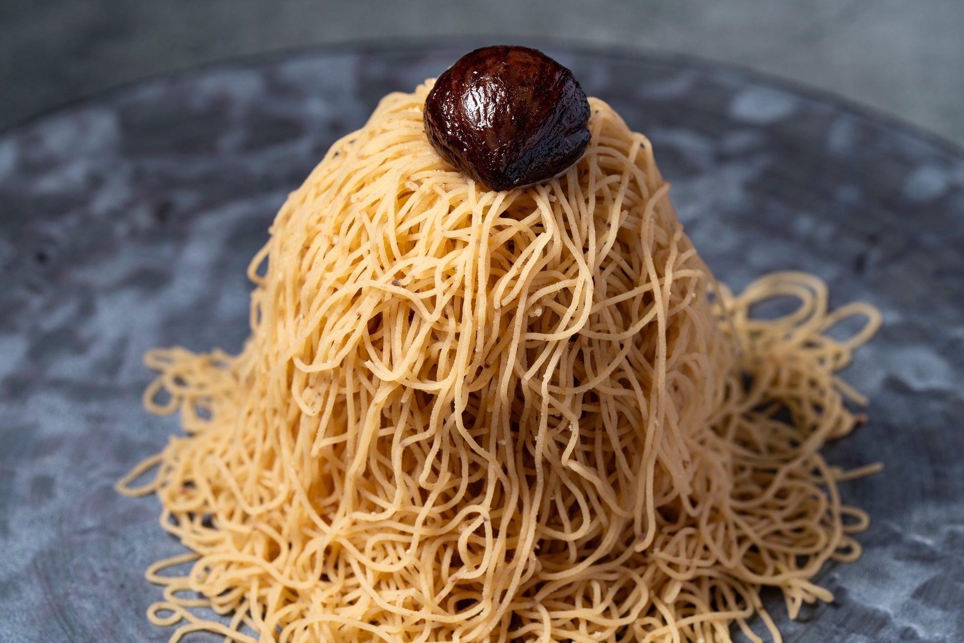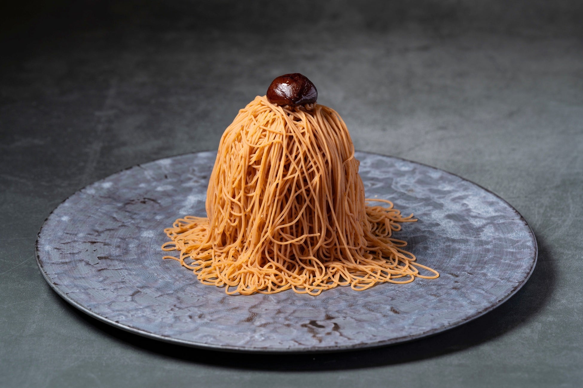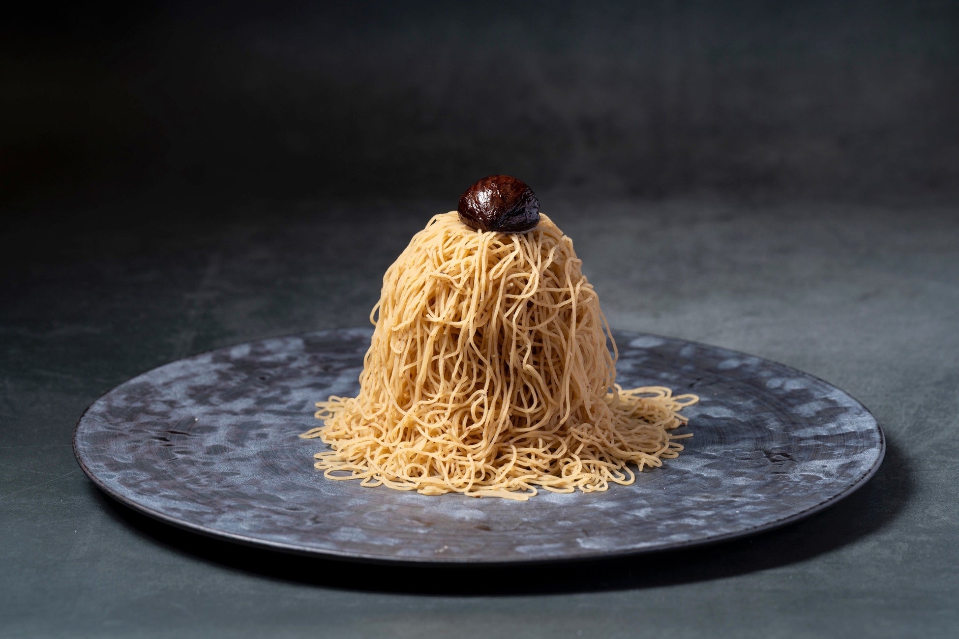 今回提供するメニューは、厳選された栗を使用した贅沢な生搾りモンブランです。特に「京丹波和栗」を使用したモンブランは、昼夜の寒暖差が大きい環境で育った和栗ならではの、糖度の高さと豊かな風味、上品な甘みが特長です。この栗本来の甘みを最大限に引き出すため、余計なものを一切加えずに仕上げた1mm極細のマロンクリームは、口に入れた瞬間に滑らかにとろけ、至福の食感をご堪能いただけます。