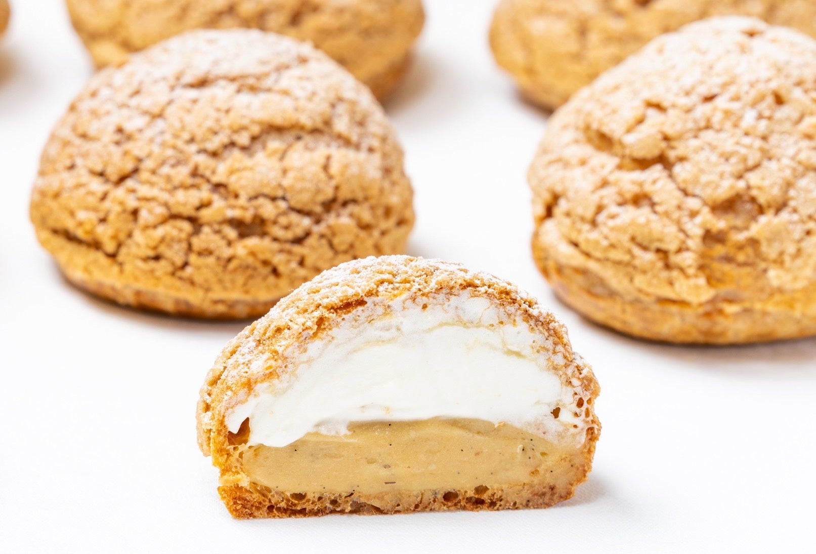 サクサクに焼き上げたクッキー生地のシューに甘さを抑えた生クリームと特製マロンカスタードクリームをたっぷりと詰め込みました。素材の風味と甘みを味わいながらさっくり食感と溢れ出すクリームの相性は奇跡としか言いようのない美味しさ。(1個 440円)