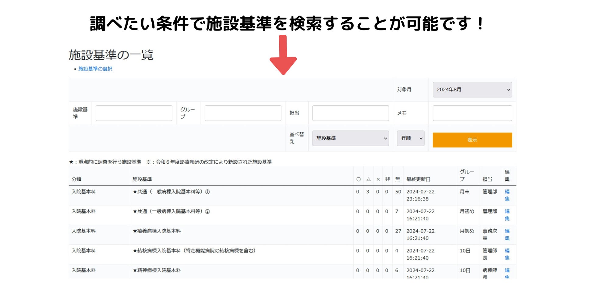 施設基準名、グループ、担当やメモなど、必要なワードで絞り込み検索や並べ替えができます。