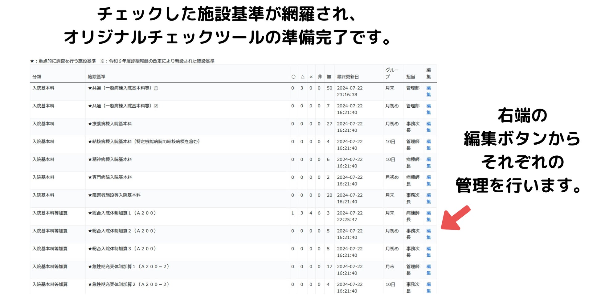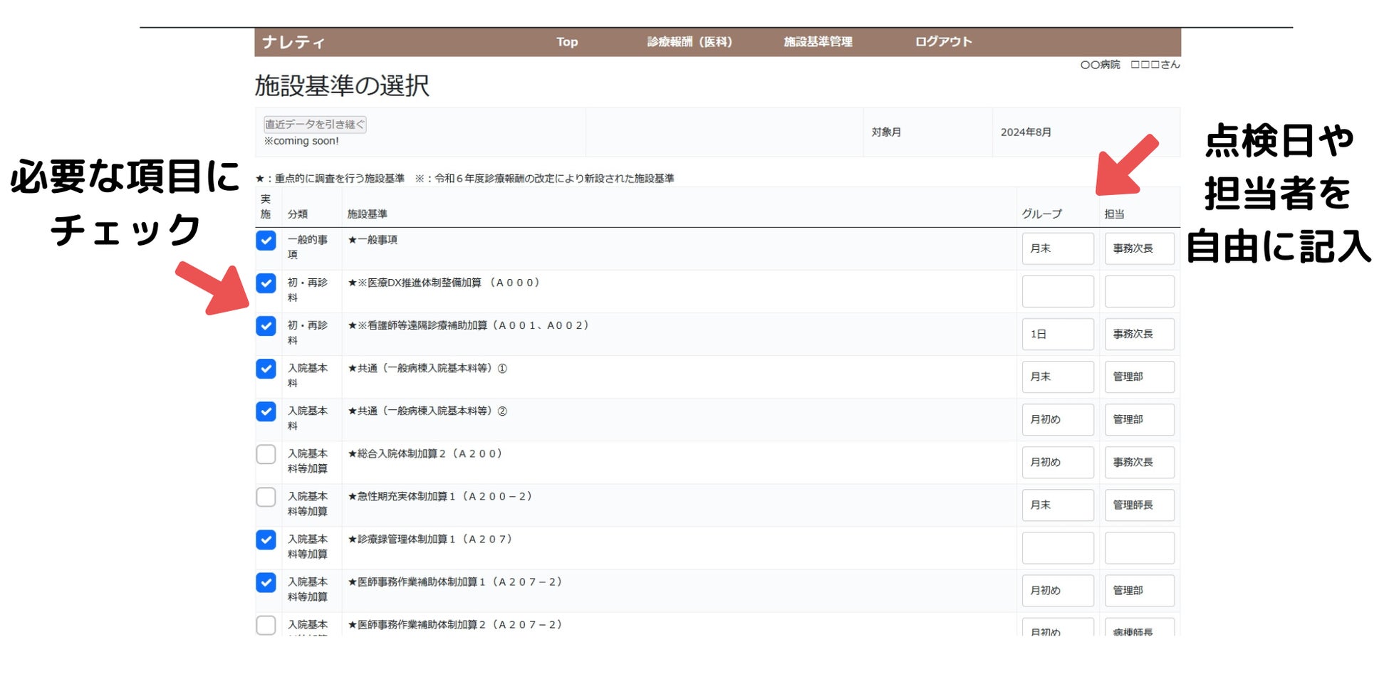 施設基準の選択をクリックして、病院独自のチェックリストを作成します。