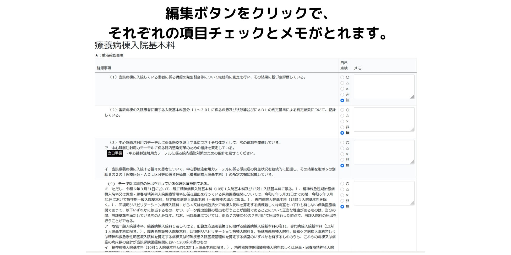 すべての病院で必要な施設基準の管理業務をデジタル化し、業務の情報共有を実現します。