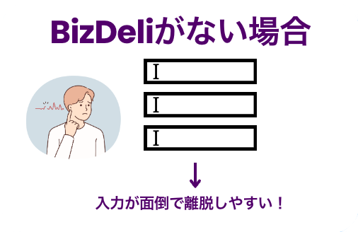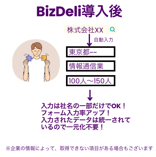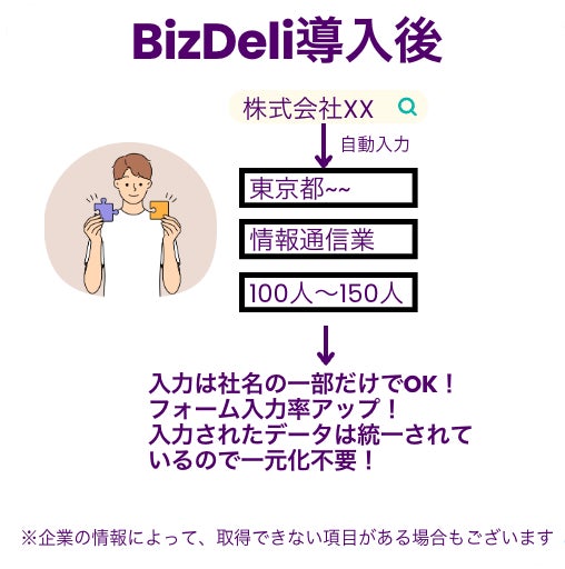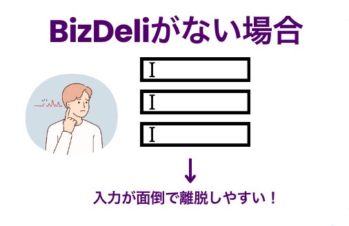 BizDeliを使用することにより、ユーザーの負担が軽減され、フォームの入力完了率の向上や入力されるデータの正規化(表記の揺れや誤入力を防ぐ)につながります。