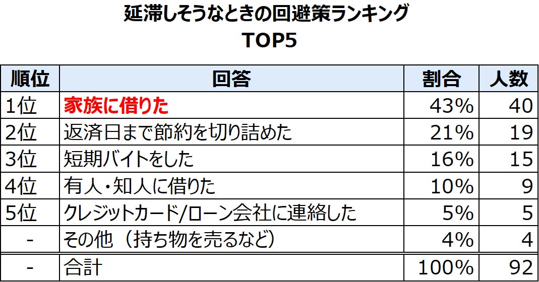 続いて以降では、延滞を経験した人に、「延滞の理由」、「延滞しそうな時の回避策」、「延滞の予防策」について質問しました。