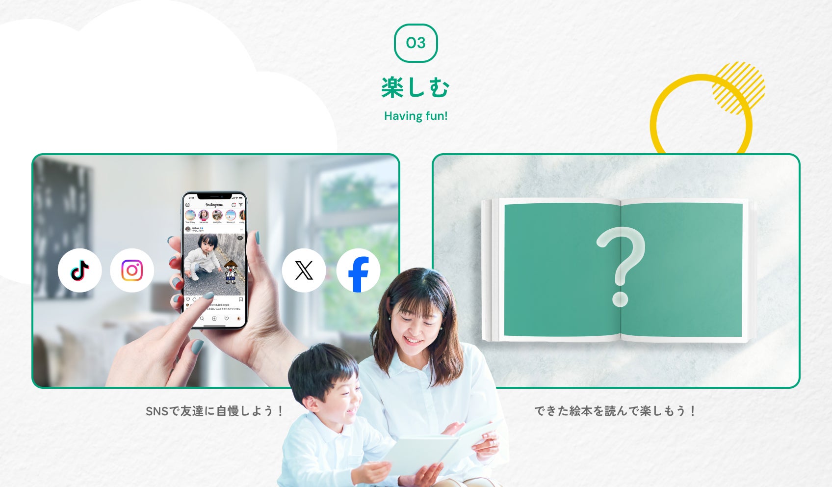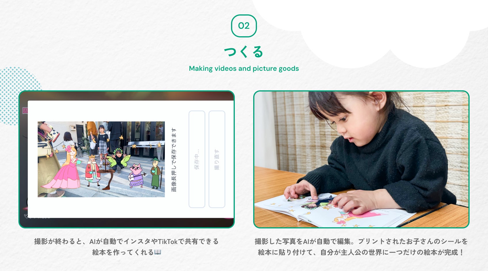 同時に、現実世界においても、画像認識によって切り抜かれた自分自身を素材としたシールを貼り付ける体験ができるプランもあり、その体験を通じて「自分が主人公」の絵本を完成させ、愛着の湧く思い出の品を持ち帰ることができます。