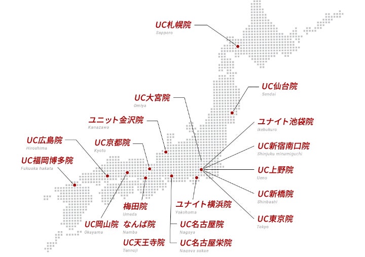 当グループは提携院を含め、北海道(札幌)、東北(宮城・仙台)、関東(東京、埼玉、神奈川)、北陸(金沢)、中部(名古屋、栄)、関西(大阪、京都)、中国(広島、岡山)、九州(福岡・博多)と全国に19院展開しております。