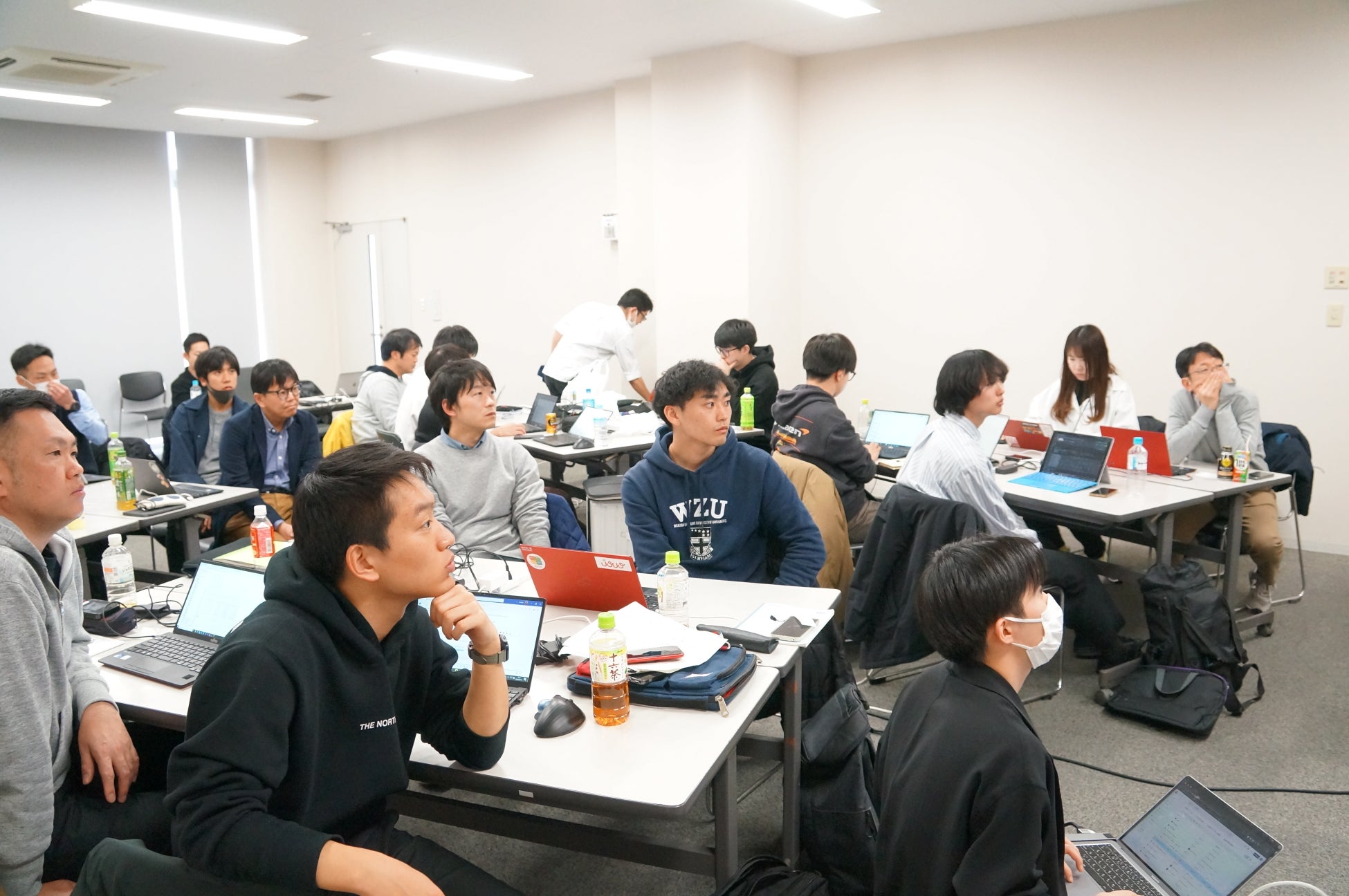 初回の研修は、SUPER FORMULAのパートナー企業である富士通株式会社やさくらインターネット株式会社等の従業員を対象に、開幕戦翌日の3月11日(月)に鈴鹿サーキットにて実施し、受講者はデータから「ラップタイムを予測する」というお題に対し、分析⽅法を検討しデータベースから結果を抽出するSQL(※)を書き出すところまで、前提となる知識の無い世界において、求められる結果を出すためのスキルを磨きました。