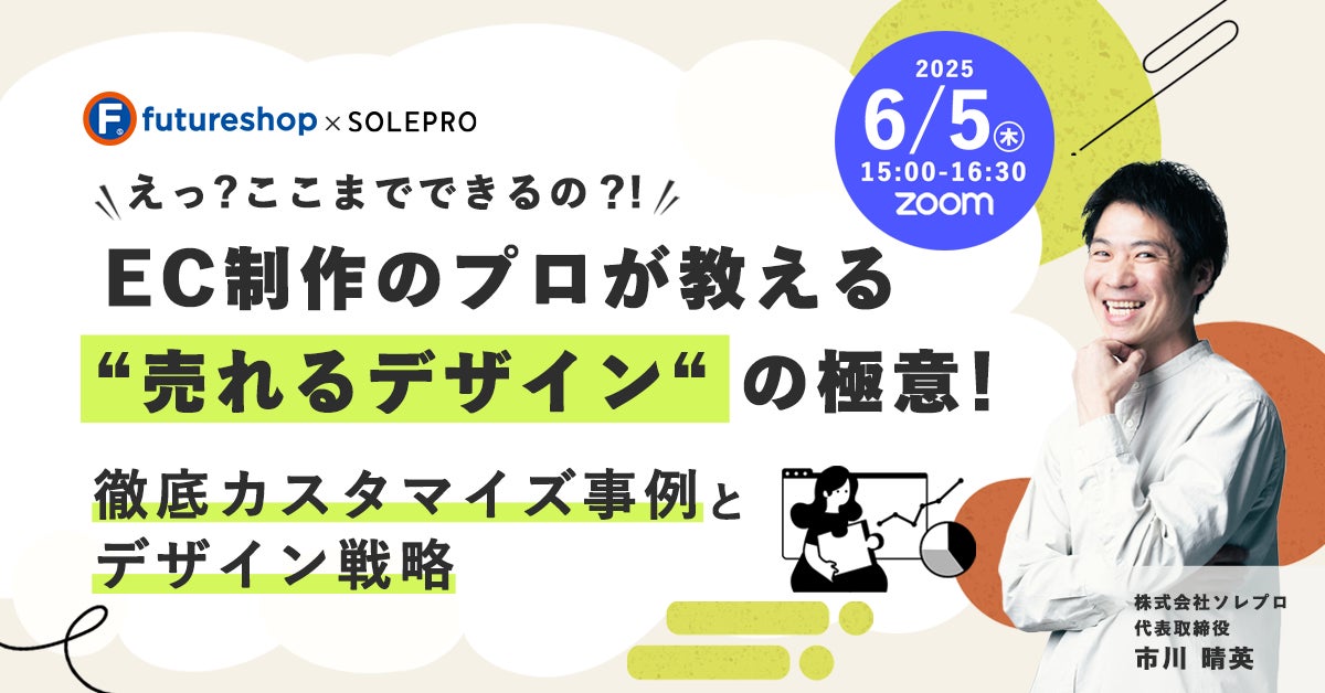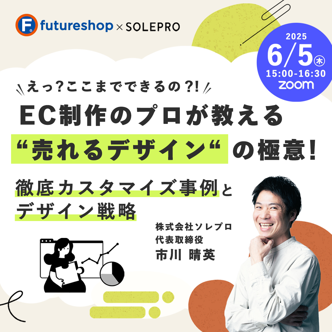 「貴方(あなた)の利益が出るまで伴走する」を企業理念に、ECサイト制作から運用支援を行う2014年創業の株式会社ソレプロ(本社:滋賀県犬上郡、代表取締役:市川晴英、以下「ソレプロ」)は、SaaS型ECサイト構築プラットフォームfutureshopを運営する株式会社フューチャーショップ(本社:大阪市北区、代表取締役:星野 裕子、以下「フューチャーショップ」)と「フューチャーショップセミナー」を2025年6月5日にオンラインで共同で開催いたします。