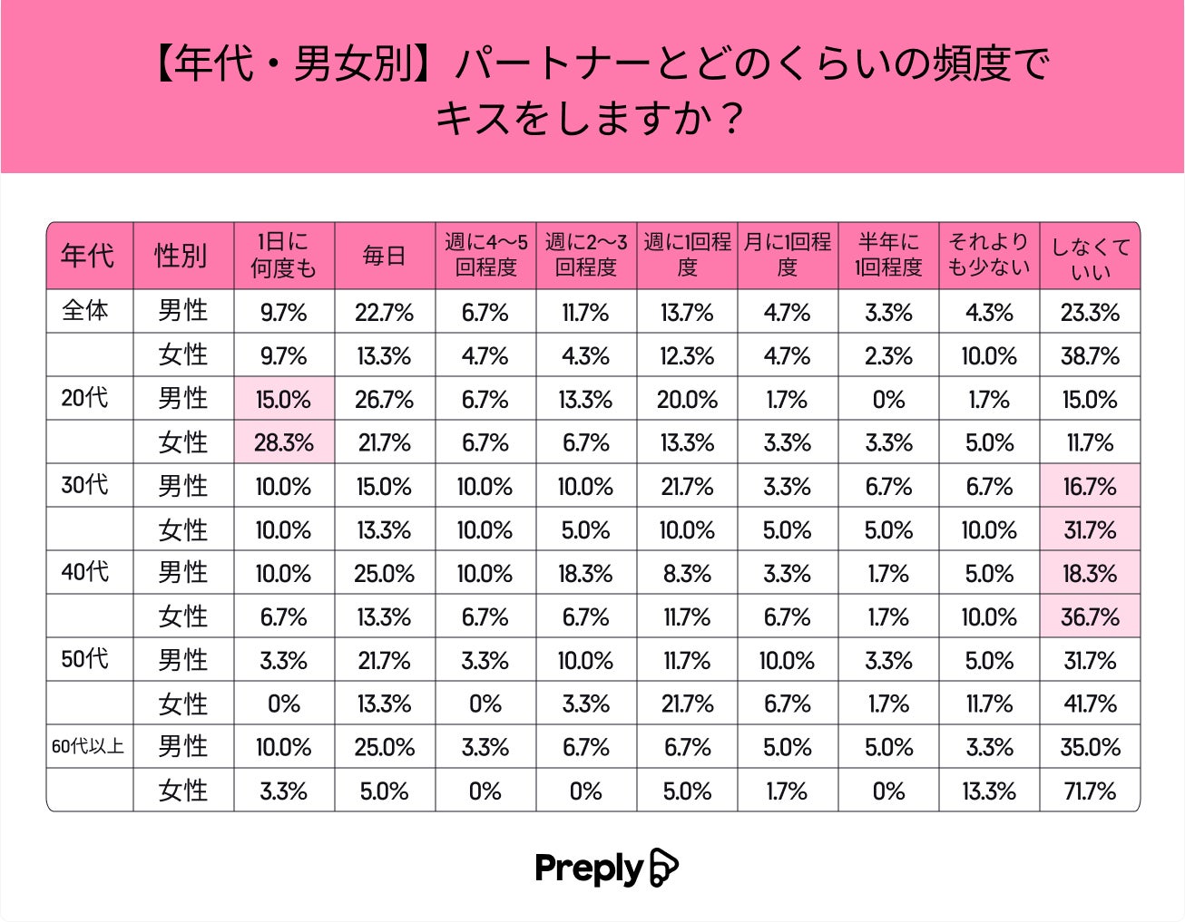 男女別でみた「理想のキスの頻度」は世代によって異なる