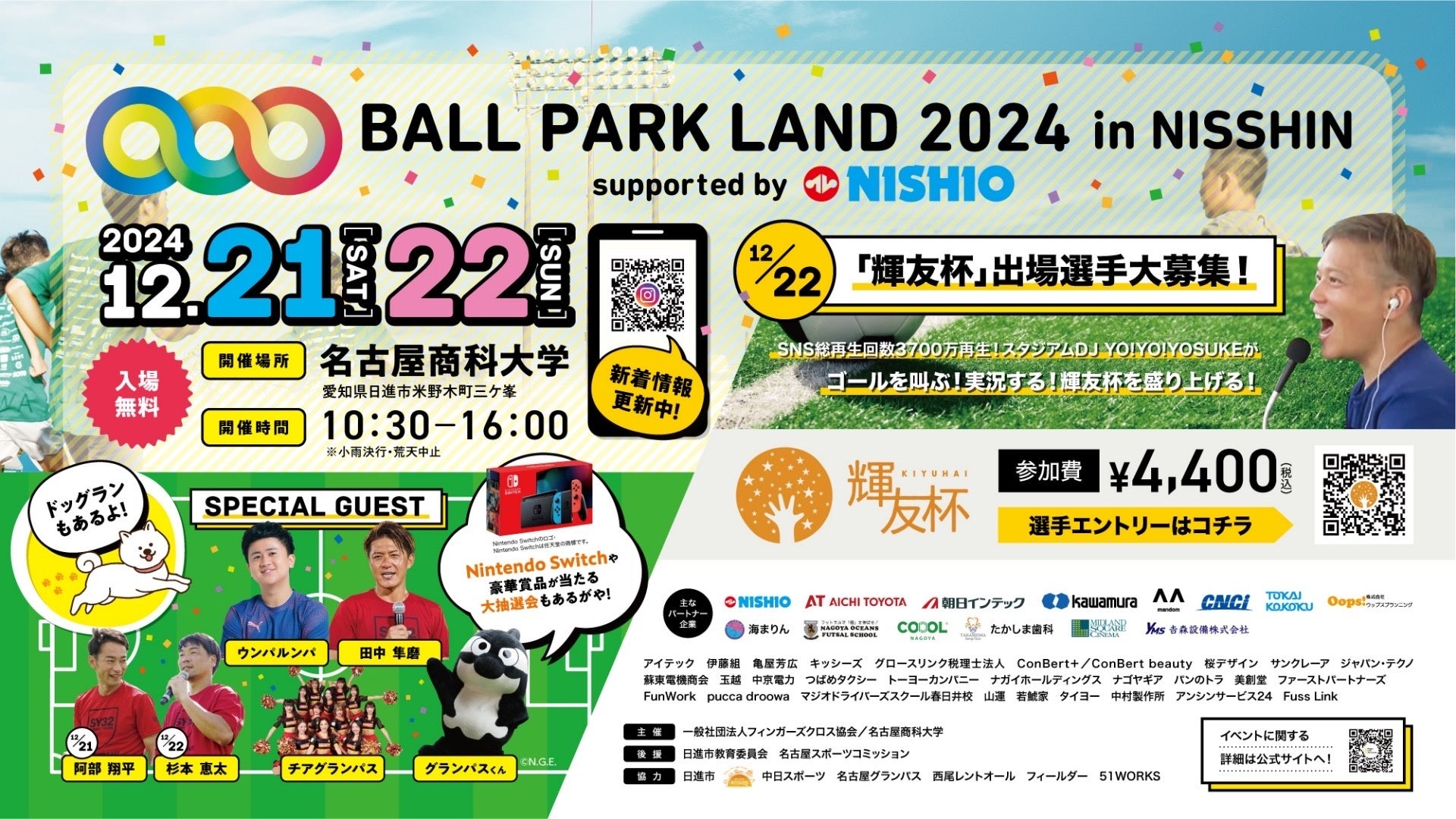 名古屋グランパススタジアムDJなどで活躍中の名古屋タレント「YO!YO!YOSUKE」がチェアマン を務める一般社団法人フィンガーズクロス協会は、2024年12月21日(土)・22日(日)に 愛知県日進市の名古屋商科大学にて「BALL PARK LAND 2024 in NISSHIN supported by 西尾レントオール」を開催します。