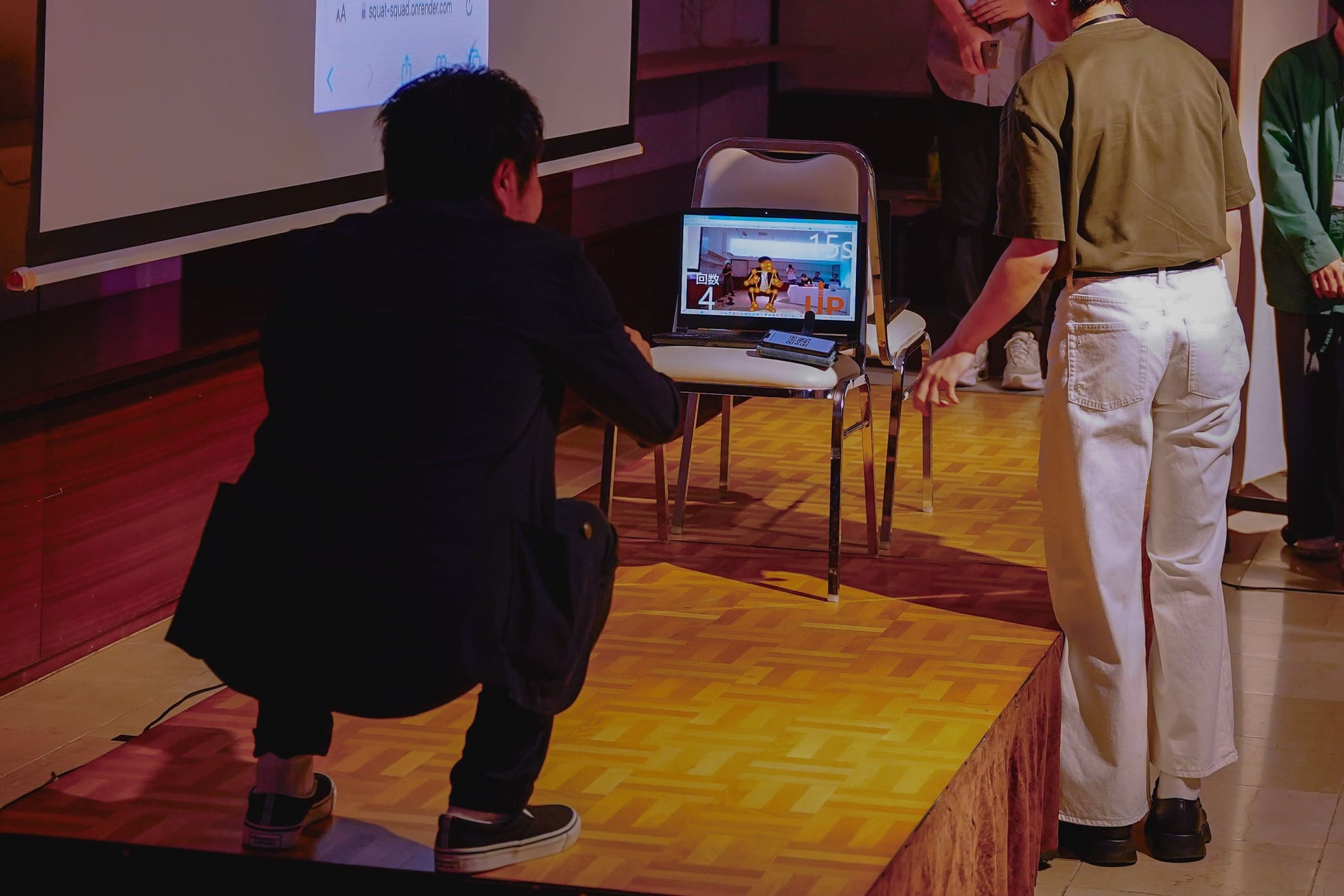 会場全体を2チームに分け、プレイヤーの「スクワット回数」とチームメンバーの「応援」から算出される「総合ポイント」の合計で勝負をしてもらうというゲーム