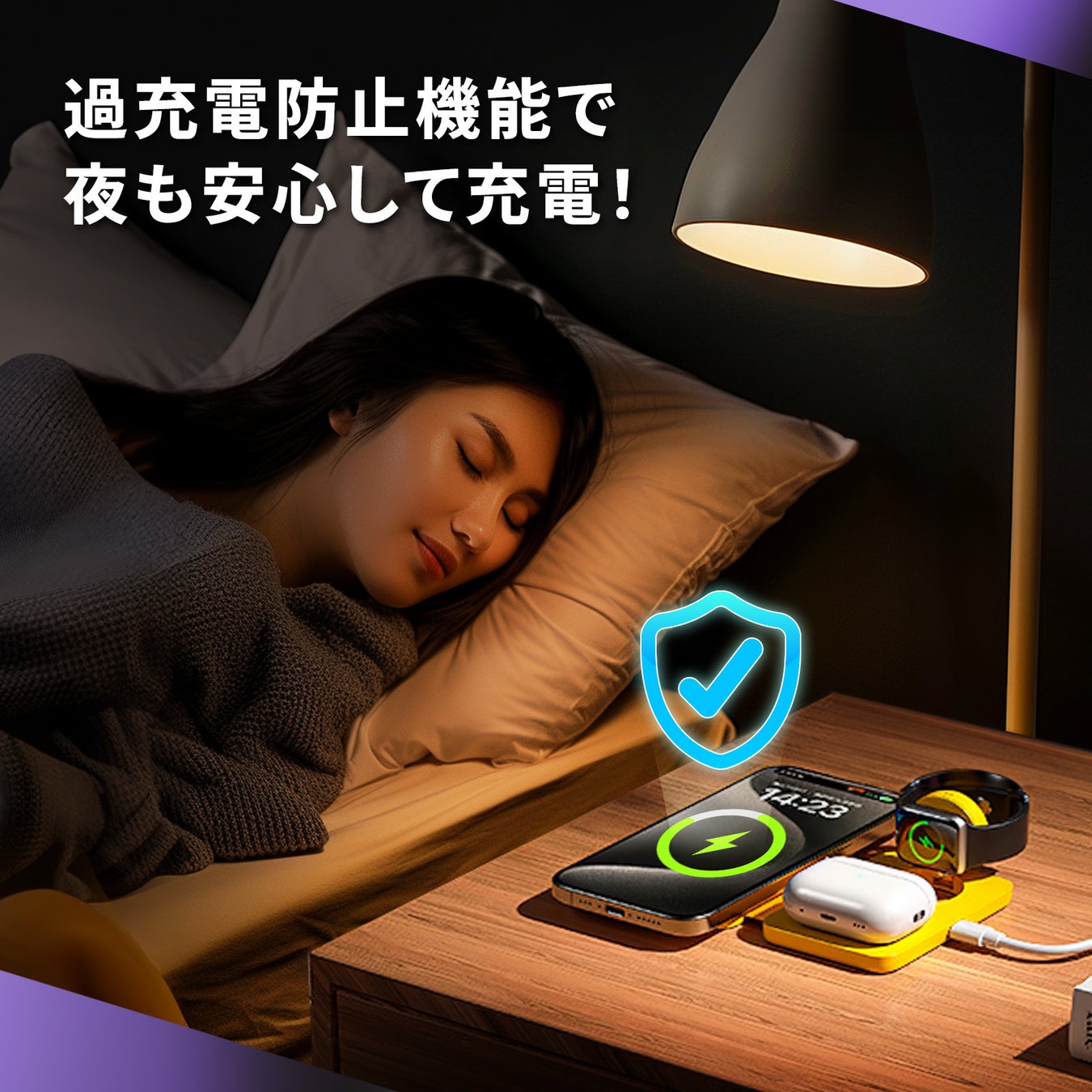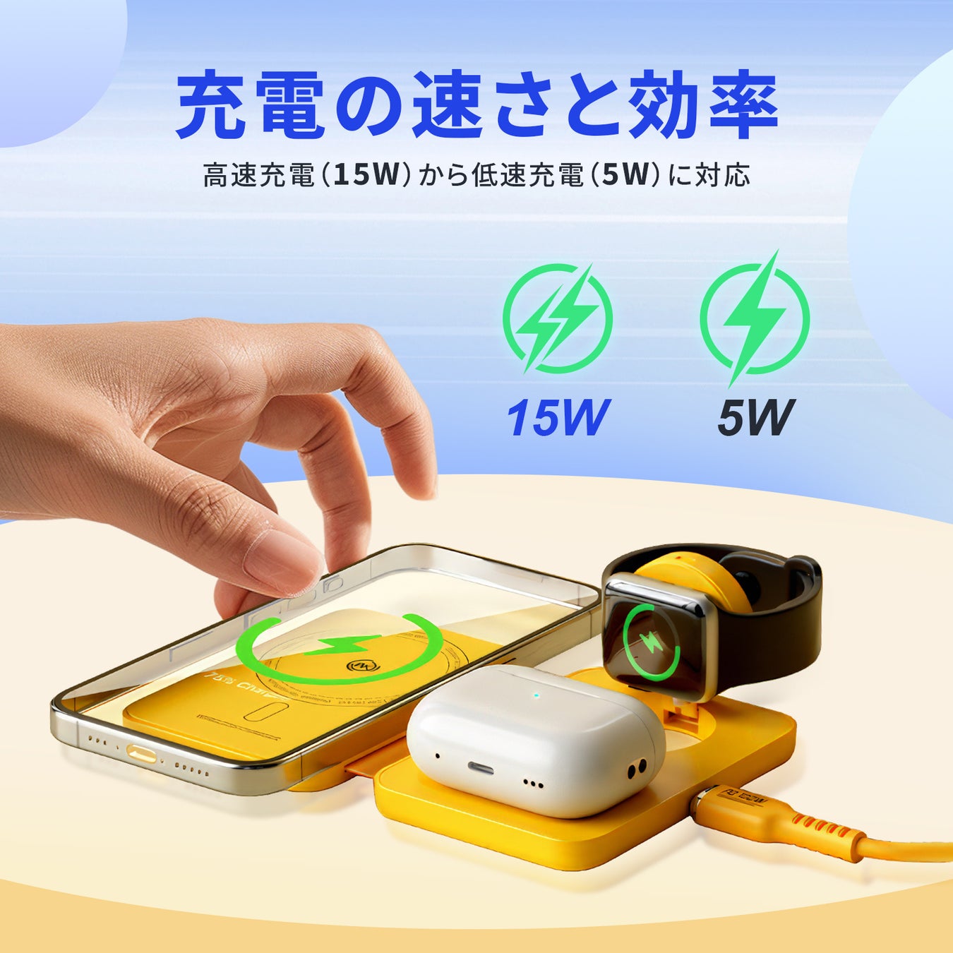 15Wの高速充電に対応し、iPhoneやApple Watchを約2-3時間でフル充電。高効率な電力変換技術により、充電時間を大幅に短縮します。持ち運びに適したコンパクト設計で、外出先でも安心して使用できます。