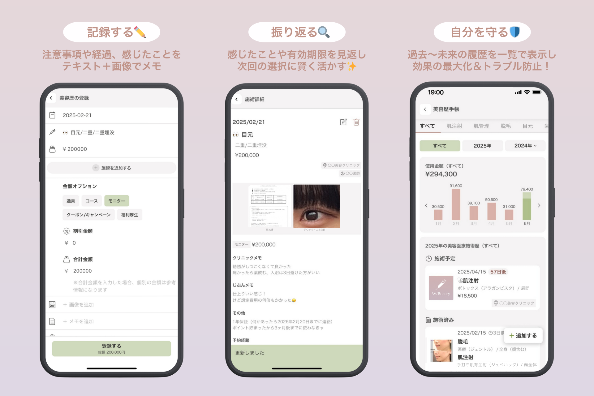 施術やクリニックに関する評価を記録し、将来の選択に役立てることができます。過去の体験を基にした選択をサポートし、より自分に合った治療を選べるようにします。