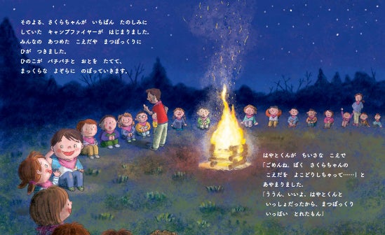 主人公の、保育園に通う“さくらちゃん”は、お泊りキャンプに参加します。でも、初めて親元を離れて一泊することに不安でいっぱいです。出発の朝、お母さんは、さくらちゃんの首にバンダナを巻いて勇気づけてくれました。出発当日、バスで隣の席になった、初めて会う元気いっぱいの“はやとくん”と同じ班になりました。その後、キャンプ場で待ち受けていた出来事とは…。