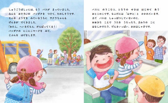 『バンダナがくれたゆうき』の主人公であるさくらちゃんとはやとくんが、キャンプという体験の中で、不安や難しい課題を、何とか自分の力で克服していくお話を読むことで、子ども達は、自分がこれから経験するであろう、園での生活に対する期待やあこがれが湧いてくるのではないかと思います。毎日の生活の中には、「はじめてでドキドキする」ことや「どうも自分が思うようにはいかない」こと、「みんなはできているのに、自分だけうまくできない」ことなど、楽しいことばかりではありません。そんなとき、自分ひとりの心の中にそれをしまっておかずに、感じたことを言葉にして伝えたり、実際に解決のために動いたり、どうしたらよいか一生懸命考えたりすると、そこには、必ず心に残るできごとが生まれます。絵本のお話に自分を重ねて、考えてもらえるとうれしいです。