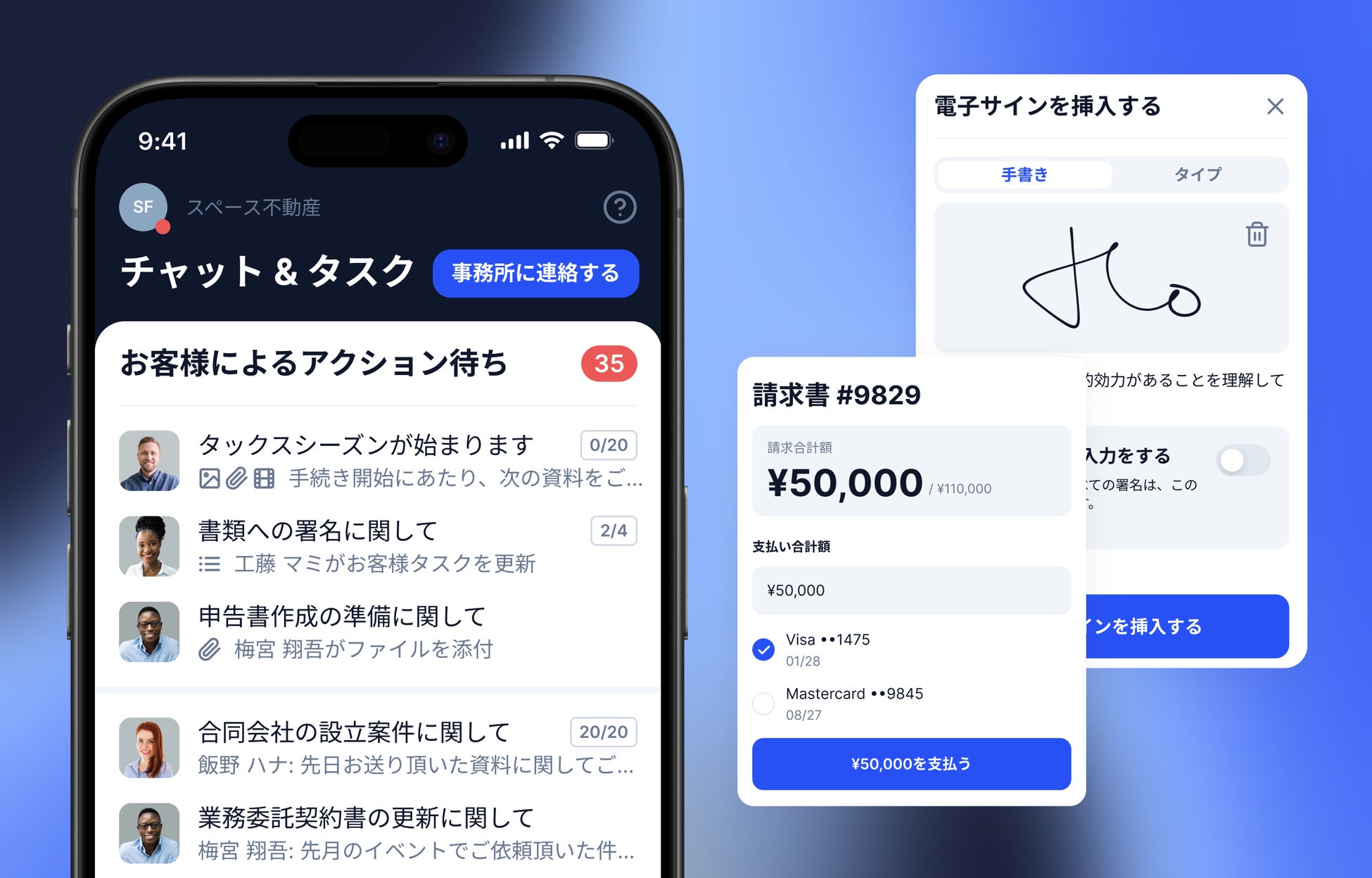 TaxDomeは、事務所内のタスク・プロジェクト管理ツール、CRM(顧客関係管理)としての運用に加え、標準機能である「カスタマー専用ポータル」を介して、事務所と顧客間のすべてのコミュニケーションの手段・場所としても利用が可能です。申込書や契約書等の電子サイン、顧客から事務所への顧問料の支払い、必要書類・情報の提出・回収、プロセスのテンプレート化、チャット形式での顧客との連絡やり取り等、カスタマーとのありとあらゆる連携を、TaxDome上で行なえます。