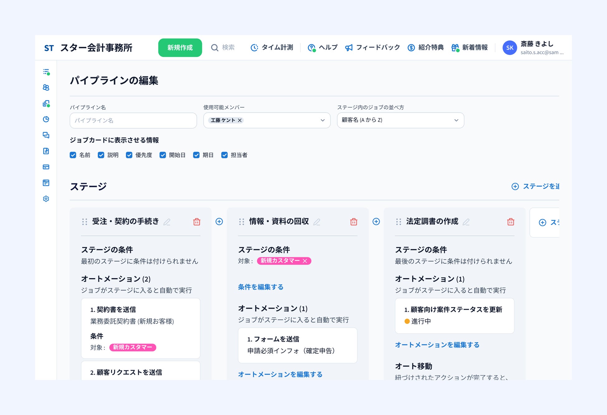 顧客へのチャットでの連絡、顧客からの資料の共有、顧客による料金の支払い、書類への電子サイン、事務所スタッフによるタスクの完了等、案件を構成するありとあらゆる要素を、オートメーションのトリガーとして設定することが可能。