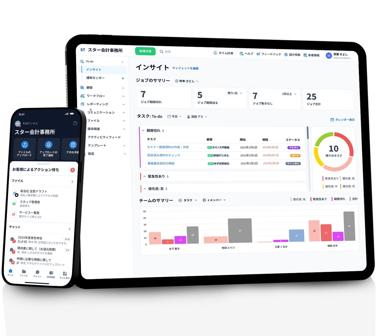事務所スタッフによる繰り返しの事務的作業にかかる時間が大幅にカットされるだけでなく、事務所と顧客が連携を取り合うプラットフォームの側面を持つTaxDomeは、顧客目線における事務所のサービス品質向上にも貢献します。