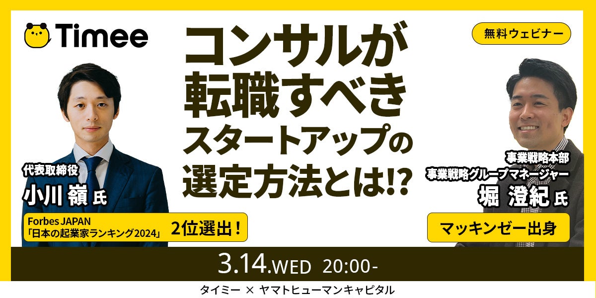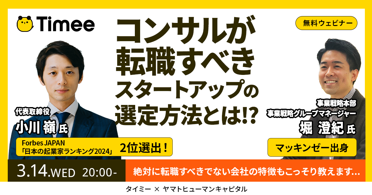 【3/14開催ウェビナー】スキマバイトで有名なタイミー小川代表登壇!コンサルが転職すべきスタートアップの選定方法とは!?