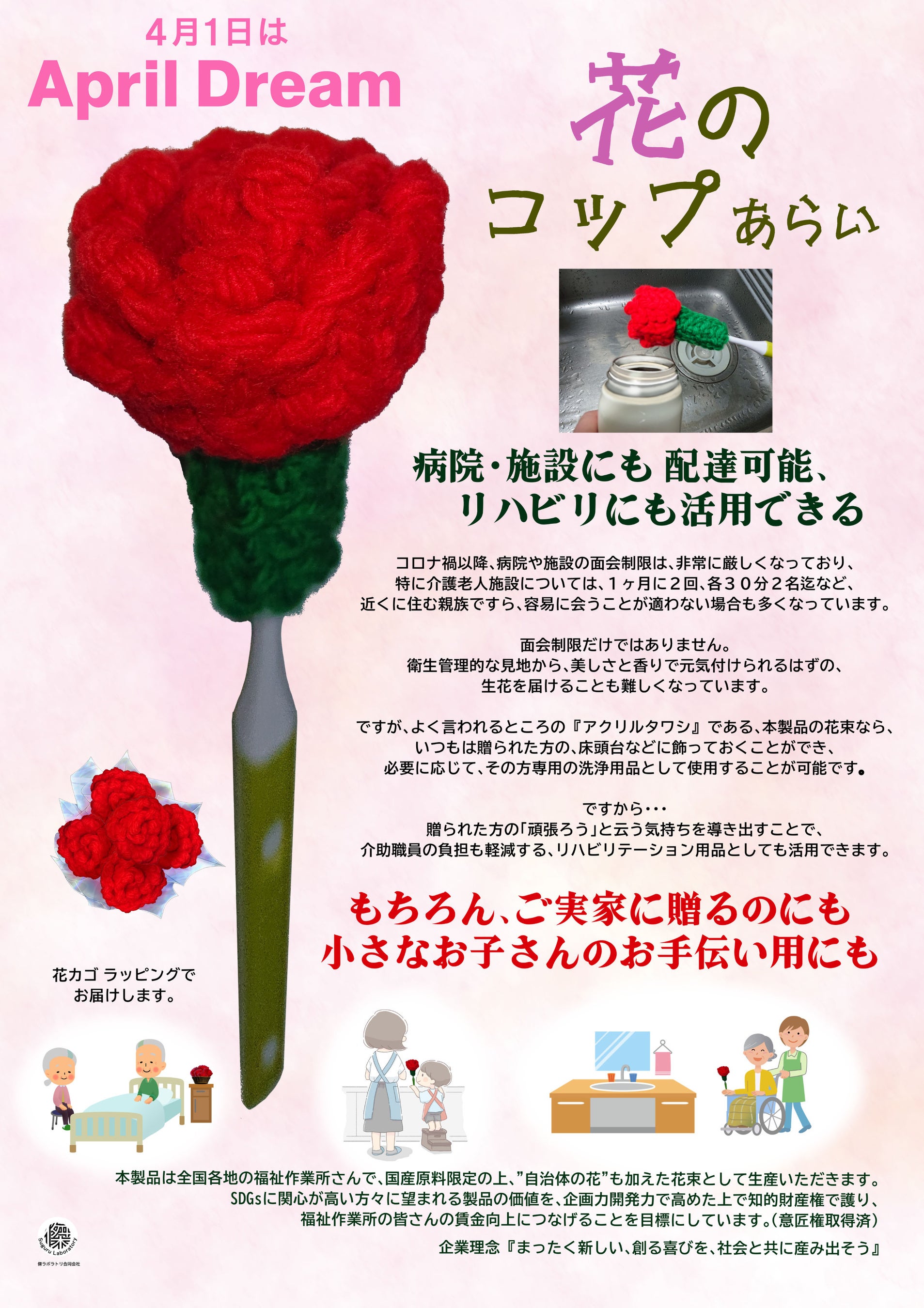 『施設や病院に配達可能、”花のかたちのコップたわし』を