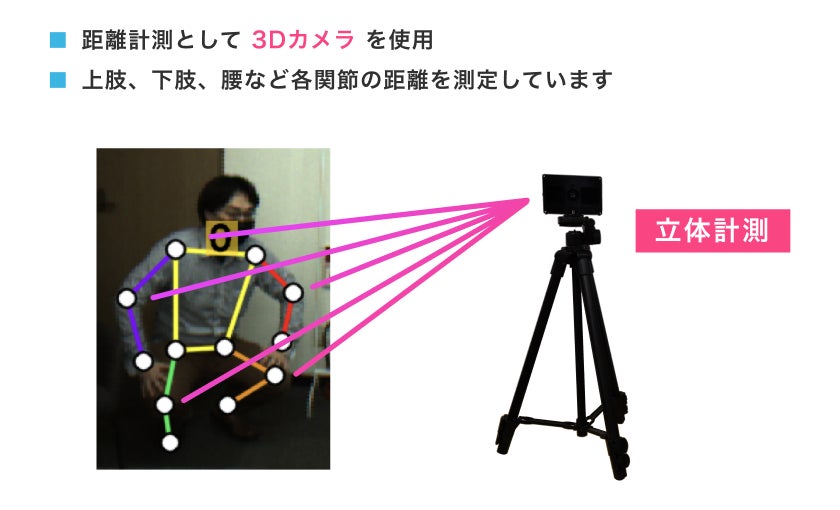 PosCheck101は3Dカメラで作業姿勢を動画撮影し、エルゴノミクスAIを活用し作業者の骨格位置を正確に認識します。さらにこの3Dカメラでは各骨格とカメラの距離を計測できるため、作業姿勢を正確に把握できるアルゴリズムを開発いたしました。
