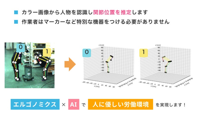 作業者にセンサーなどを取付けること無く、普段の作業を動画撮影しながらOWAS法*1にて定義する作業姿勢の負荷判定を自動測定いたします。従来の目視による姿勢判定では、判断に恣意性が入ることや、長時間にわたる測定が困難でしたが、本システムにより一定の判断基準で、1秒毎の長時間計測が可能となりました。この手法による自動計測に関し特許出願(特願2021-169943)をしております。