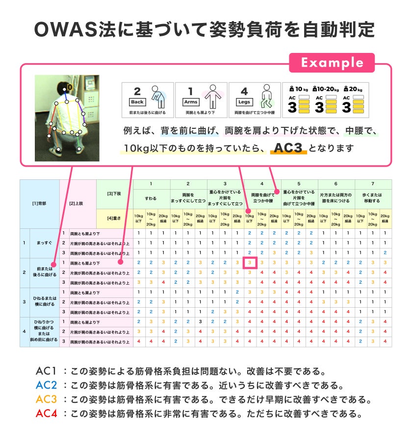 エルゴノミクスAIで人体骨格を認識、3Dカメラで作業者を動画撮影するだけで、北欧フィンランドで開発された世界的な作業姿勢評価法OWAS法*1に基づき、作業姿勢の負荷を4段階に自動分類。