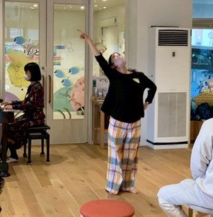 この日に出演したのは、ダンスのストウミキコさんと、ピアノの岩下真麻さん。カラフルなリトミックスカーフを使い、ピアノの演奏に合わせて参加者の皆さんが体を動かすと、会場が一気に華やぎ、楽しい雰囲気に包まれました。