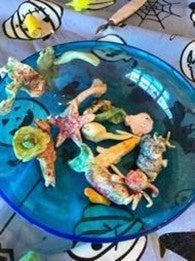 お子さんの豊かな発想力と手先の器用さで作品がどんどん作り上げられ、あっという間に何十個もの粘土作品が出来上がり、可愛い虹色の水族館が出来上がりました。