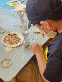 8月9日の合同授業では、「洗濯のりとラメフレークを使ったサマードームづくり」「貝殻とビーズを使ったマグネットづくり」「お絵かきコンクールの絵を描く」の三つのプログラムを実施しました。工作について、子どもたちは「もう一個作りたい」「また作りたい」ととても楽しめた様子でした。