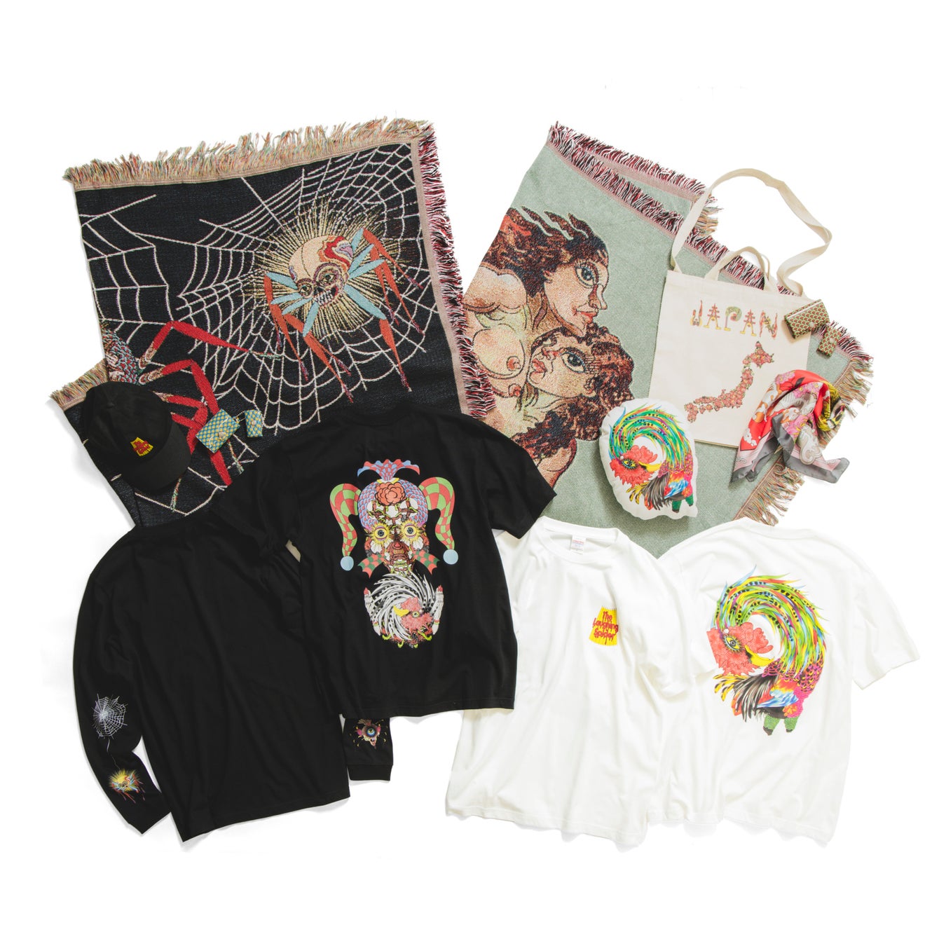 田名網の代表作のひとつである「笑う蜘蛛」シリーズをフィーチャーし、Tシャツ、キャップ、ブランケットなど幅広いアイテムを展開。
